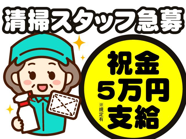 仕事内容 <パート・アルバイト/工場施設内の清掃> =・=・=・=・=・=・= 今なら入社祝金5万円支給! (規定あり) =・=・=・=・=・=・= //// ここがPOINT //////// ・人気の清掃作業 ・清掃未経験スタートOK ・教育体制しっかりで安心 ・資格不問 ・男性、女性問わず活躍中 ・大手企業で長期安定 ・30代・40代・50代・60代活躍中 ・中高年・シニアも活躍中 ・定年退職後の方も活躍中 ・主婦(夫)活躍中 <仕事内容> ◆工場施設内の清掃 就業先は電子部品を製造している大手企業内です。 【1】玄関・廊下・階段・更衣室・トイレ等の清掃 複数の建物を移動しながらのお仕事 【2】会議室・更衣室・廊下・トイレ等の清掃 1つの建物清掃!コツコツ業務 具体的には… ・玄関・廊下・階段・休憩室・更衣室・トイレ・その他清掃 ・ゴミの回収 等 〇コツコツ・モクモクとできる作業です <未経験でも安心の理由> 〇入社後の教育体制がしっかりあります。 〇先輩スタッフと同行しながら作業を行えます。 〇家庭清掃の延長上で出来るシンプルな作業です。 〇難しい作業やプロ用の用具の使用はありません。 なので、清掃未経験の方も まずは気軽にご応募お待ちしております。 <こんな経験がある方は尚可> 〇清掃 パート・アルバイト 〇清掃スタッフ パート・アルバイト 〇軽作業 パート・アルバイト <働きやすい時間帯> シフト制、月曜日~土曜日までの間で週2~3日出勤です。 土曜日は月に1~2回程度出勤いただきます。 週数回と適度な時間帯なので、家庭と仕事との両立もしやすいです。 ・勤務時には制服(上着)を着用頂きます ※靴、ズボンは本人準備