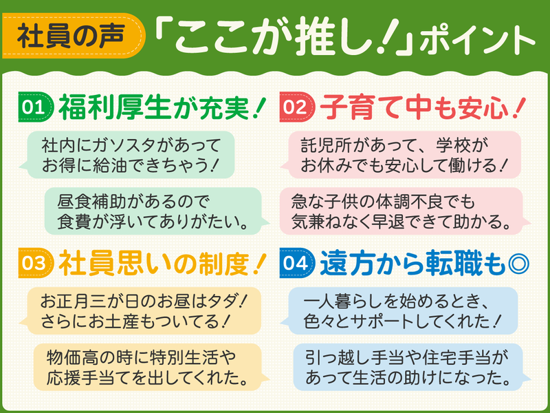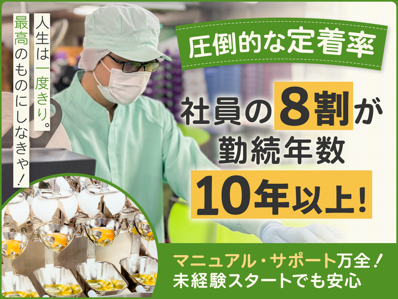 仕事内容 \ 面倒見の良さが自慢!働きやすい職場 / 《未経験歓迎》サポート体制抜群で安心! 《勤続10年以上が8割》安心して長く働ける 【 働きやすさの秘訣はここ! 】 *マニュアルあり!失敗やミスが発生したら 改善に向け、みんなで考える会社です。 *基本転勤なし!将来設計も立てやすい! *託児所あり!小学生・中学生も利用OK! *子供の参観日などの家族の大切なイベント でのお休み調整可能!  ̄ ̄ ̄ ̄ ̄ ̄ ̄ ̄ ̄ ̄ ̄ ̄ ̄ ̄ ̄ ̄ ̄ ̄ ̄ ̄ <仕事内容2パターン:希望と適性により決定> ①たまごのパック詰め・検品 >>スーパーや各小売店に提供するたまごを パック詰めするお仕事です! ~仕事の流れ~ 1.自社農場のたまごが入った台車を 機械にセット 2.洗い終わったたまごを検品 3.パックに入ったたまごを封緘前に検品 4.パックを封緘した後に検品して梱包 5.最後に皆で仲良くお掃除し完了! - ②液卵の製造 >>お菓子屋さん、ケーキ屋さんに 卵の中身を提供するお仕事です! ※卵は機械ですべて割ります ~ 仕事の流れ ~ [1] 卵の入った台車を機械にセット [2] 機械で割った卵の中身を確認 [3] 確認した中身を梱包 [4] 殺菌した卵を1Lの牛乳パックに充填  ̄ ̄ ̄ ̄ ̄ ̄ ̄ ̄ ̄ ̄ ̄ ̄ ̄ ̄ ̄ ̄ ̄ ̄ ̄ ̄ < 都路のたまご > 「生卵が苦手なうちの子が 都路のたまごだけは食べられた」 …そんな声を多数いただく"都路のたまご"。 築地で一番評価の高い卵焼き専門店や 有名和菓子メーカーさんの 高級カステラにも使用いただています。 旨味・風味を上げるため、 鶏種から給与するエサまでこだわり、 日本一美味しい卵を目指して、 日々研究を重ねています。 -------------------- 《 社長より 》 どうせ働くなら… 大切にしている価値観を近い仲間と 働けると良くないですか!? 私達は次のようなことを大切にしています。 *失敗した時、該当者を責めるのでなく 改善に向け、みんなで考える *自分の趣味や、子供の参観日などの 家族の大切なイベントを 大切にしたい方を応援 仕事も趣味も家族も大切。 1度きりの人生だから、 どれも大切に最高の人生を生きたいし、 スタッフ全員に、幸せでいてほしい と思っています。 あなたに会える日、 ご縁を楽しみにしています。