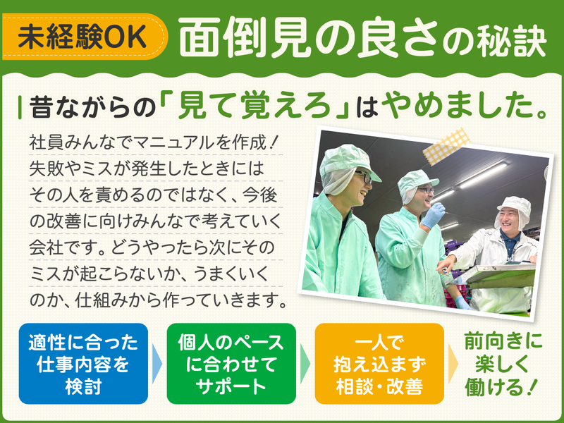 求めている人材 \\ 未経験&ブランク大歓迎! // 成長をサポートできる環境が整っています! * 新しいことにチャレンジしませんか? *  ̄ ̄ ̄ ̄ ̄ ̄ ̄ ̄ ̄ ̄ ̄ ̄ ̄ ̄ ̄ ̄ ̄ ̄ ̄ ̄ 【必須】普通自動車免許 <こんな方にオススメ!> ・卵が好き ・コツコツ黙々作業が好き ・協力しながらよりよい体制を作りたい ・家事や育児など、私生活と両立したい ・ワークライフバランスも大事にしたい *学歴不問 *年齢不問 *経験不問 *業界未経験歓迎 *普免以外の資格不問 *主婦・主夫歓迎 *子育てママ在籍中 *ブランクOK *第二新卒歓迎 <未経験者歓迎!> 一人ひとりの適性に合った仕事を検討し、 個人に合ったスピードで わかるまで丁寧に指導していきます! 1人にしません!放置は絶対にしません! 分からないことや不安なことは なんでもすぐに聞いてください! 一人ひとりが前向きに楽しく働けます。 < 色んな方が活躍しています > システムエンジニア、飲食店のスタッフ、 職を転々としていた方などなどなど… 異業種から入社して今では責任者に なっている方も多数活躍中です! -------------------- <経験者歓迎!こんな経験も活かせます> 軽作業・製造・倉庫内作業・構内作業員 工場内作業・加工・組立・仕分け・梱包 ピッキング・目視検査・検品・内職 など ※上記経験の雇用形態は問いません※ (正社員・アルバイト・パート・ 契約社員・派遣社員・委託社員など)
