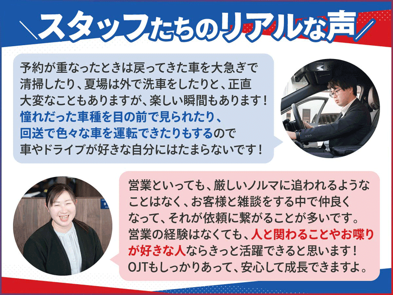 職場環境 【30代活躍中の職場】 採用基準は 「お客様と良好な関係を築ける方」 「元気に働ける方」 これだけ! 営業の経験や車の知識などは一切 必要ありません。 入社後は一人ひとりのスピードに沿って できることを増やしていくつもりなので 安心してご応募くださいね!