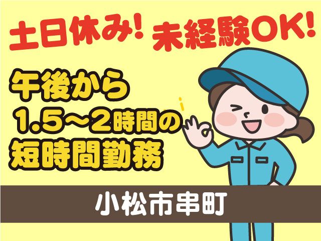 仕事内容 小松市串町の企業内で 日常清掃スタッフのお仕事です。 ◎月曜から金曜の週5日勤務 ◎午後から1.5時間~2時間ほどの短時間! ◎時間帯ご相談ください 【お仕事内容】 玄関・廊下・階段・食堂・男女トイレ等の 清掃をお願いします。 【午後から1.5時間~2時間の短時間!】 月曜から金曜の週5日 13:00〜16:30の間で1時間半~2時間程度の勤務です。 勤務時間ご相談ください。 短時間で家庭との両立もしやすい環境です。 <未経験者大歓迎> 清掃業未経験の方も大歓迎です。 先輩スタッフがイチから丁寧に 指導いたしますので安心して お仕事スタートできます。 分からないことや相談事も しっかりフォローいたします。 <男女・年齢不問> 年齢・性別は問わず活躍しています。 子育てが落ち着いた方、 「運動不足を解消したい」 「お小遣い稼ぎをしたい」 「定年後の働き口として」 そんな方も多数活躍中です。 <アドバンス北陸サービスについて> 弊社の目標は、すべてのお客様に 満足していただくことです。 そのために、人材の育成に力を入れており 自己啓発にもつながっていきます。 快適な空間づくりや清掃を通じて 人間力も一緒に磨いていきませんか? まずはお気軽にお問い合わせください。