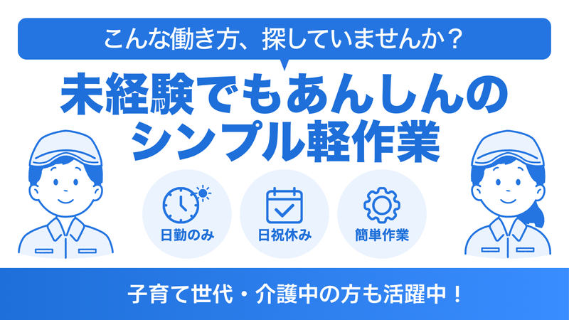 仕事内容 コツコツ・モクモク作業が得意な方、大歓迎! 当社は大手メーカーの小物部品を中心に、塗装や加工を専門に行っている安定企業です。 このたび、製品の検品や軽作業を中心としたスタッフを募集します! ◎―――――――――――――――――◎ まずはシンプルな軽作業からスタート。 慣れてきたら、指示書に沿って自分のペースで段取りできます。 わからないことはいつでも質問OK。未経験の方にも丁寧にお教えします。 チームで支え合う働きやすい環境です♪ ◆ 具体的には… ・塗装後の部品の検品 ┗ キズや汚れがないか目視チェック ┗ 問題がなければ箱詰め ・シール貼り ┗ 指定箇所にシールを正しく貼るだけ! ・ネジはめ ┗ 小さな部品にネジをセットする簡単作業 ・生地並べ ┗ 製品を所定の場所に並べる など 手順を覚えた後は、家事の段取りのように“順番決め”を自分である程度調整できます。 難しい判断やクレーム対応はありません。 先輩スタッフがしっかりフォローするので、未経験の方でも安心してスタートできます♪ 接客業務はなく、黙々と作業することが好きな方にピッタリ。 「集中して働きたい」「コツコツ作業が得意」という方、大歓迎です! ▼詳しくは当社ホームページをご覧ください▼ https://www.okumakot.com/recruit/femaleemployee/ 電話でのご質問もお受けします♪ 072-988-1363 ◎―――――――――――――――――◎ 【通勤について】 近鉄けいはんな線「新石切駅」から自転車で約7分。 自転車の貸し出しもあります。 車・バイク通勤もOK! 会社から徒歩10分ほどの場所に、無料の駐車場をご用意しています。 【福利厚生について】 ウォーターサーバー完備、 夏場は塩タブレットやアイスの支給もあります♪ 健康診断・インフルエンザワクチン全額補助 工場内はクーラー完備で、快適にお仕事ができます。 社内行事として、年に1回BBQ大会や社外研修+昼食会を開催! スタッフ同士の交流を深める楽しい時間もあります。 \誰でもできるカンタン作業♪/ 「工場の仕事って難しそう…」 「経験がないとできないのでは?」 そんな心配は不要です! ◆丁寧な研修あり! いきなり1人で任せることはありません♪ ◆先輩スタッフがしっかりフォロー! いつでも質問OK! ◆シンプルな作業! 未経験でも安心◎ ◆空調完備&残業ほぼなし ◆平均40代の女性スタッフ活躍中/定着率◎ ◆重い運搬は男性スタッフが対応します。 今いるスタッフもほとんどが未経験スタートでしたが、 仕事に慣れて活躍しています! 「やってみたい!」という気持ちがあれば大丈夫! 安心してご応募くださいね♪ \働きやすい環境が整っています!/ ◆工場内は空調完備で一年中快適♪ ◆休憩時間には工場すぐそばの喫煙所でリフレッシュOK! ◆ベビーシッター派遣割引券が利用可能!介護中や子育て中の方でも働きやすい環境です。 平均40代の女性スタッフが多数活躍中です。 地道に真面目に働ける20代の方も多数活躍しています。 「職場の雰囲気がいい!」と定着率も抜群◎ 重い力仕事やリフトの運搬は男性スタッフが対応します。 現在19名のスタッフが在籍! みんな和気あいあいとしていて、何でも気軽に相談できる環境です♪ \こんな方にピッタリ!/ ◆コツコツ・モクモク作業が好きな方 ◆一人で集中して作業するのが得意な方 ◆未経験からチャレンジしたい方 ◆接客の仕事が苦手な方 ◆工場勤務の経験を活かしたい方 資格・経験・学歴は一切不問! 「とりあえず話を聞いてみたい」という方も歓迎です♪ 【ポイント】 ◇交通費支給 ◇土日祝休み(年間休日115日) ※会社カレンダーにより、土曜日は月0~1回程度出勤あり ◇残業ほぼなし ◇空調完備で快適 ◇ベビーシッター割引利用OK ⇒子育て中の方も安心! 【応募~採用までの流れ】 1)応募フォームまたはお電話でエントリー 2)担当者より面接日程をご連絡 3)面接&職場見学(気軽にお話しましょう!) 4)内定(試用期間)・お仕事スタート あなたのご応募、お待ちしています^^