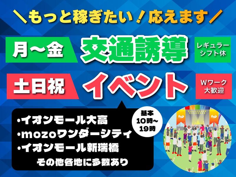 仕事内容 名古屋市及び近郊の建設工事現場、大型ショッピングセンター、イベント会場、 これから人気のお祭りなどでの交通誘導をお願いします。 具体的には、車両や歩行者の安全な通行を確保するために、 信号機や手旗、誘導灯を使って交通の流れを考え、事故や混雑を未然に防ぎます。 また、駐車場での誘導や案内業務も行います。 交通誘導警備の仕事は、 人々の安全を守るために重要な役割を果たすため、 責任感と冷静な判断力が求められます。 また、様々な状況に対応するために、 コミュニケーション能力や協調性も必要になってきます。 でも言うほど難しくありません。まずは体験してみましょう! 未経験者にも研修があり、経験を積むことでスキルを磨くことができます。 「使わないのが幸せな技術って?」 教育では、AEDの講習をはじめ、他人を助ける技術・知識を習得できます。 万が一、学んだその技術が使われなかったとしても、人の生命を救うことになると信じて憶えた学習は価値のある行為であると信じています。 世の中にとっても、人々にとっても、私たちの学んだ内容が無駄になることが幸せなのかもしれません。 自分には使うことができないのが少し淋しいですが、それが私たちには最高のやりがいなのです。 <前職製造派遣スタッフのAさん> 私は派遣会社の現場職から警備のことは何も知らない状態で転職しましたが、 周りの先輩が親切に指導してくれたお陰で今では立派に('▽')現場を務めています(笑) <前職トラックドライバーのBさん> 50歳で転職しました。 前職はトラックの運転手をしていましたが、目の調子が悪く夜間走行に不安がありました。 交通誘導をされている方をよく見ていましたので一度経験してみようと思い入社。 そこから警備の奥深さを知り、今では現場の責任者を任されています。 <前職飲食店従業員のCさん> 以前はレストランで働いていました。 コロナ禍により休業状態となったため、短期で警備を始めました。 週末にはいろいろなイベントがあり、 実際に現場を訪れて無事にイベントを終了させ、 来場者の笑顔に触れたときに「喜び」のショックを感じて それが今まで続いている貴重な体験となっています。 楽しみながら仕事をして気付けばもう入社4年目になってしまいました。 <前職コンビニ従業員のDさん> 元々街中で良く見かけていたパープルの制服は親近感が湧きました。 不安も少しある中で仕事をスタートしましたが、 自身の合図で交通流が生まれ、 渋滞のない完璧さを作り出せたことの感動が今の仕事の礎です。