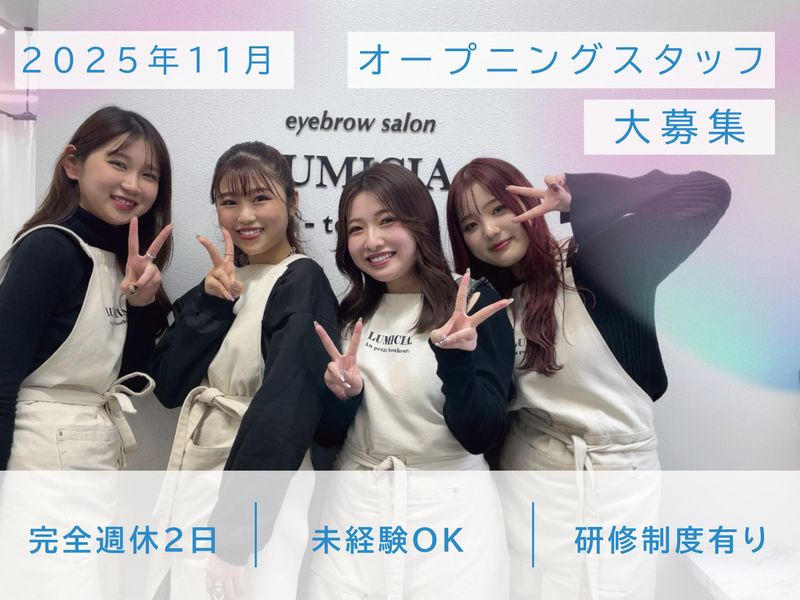 仕事内容 =================== ★ 2025年11月NEW OPEN ★ 【 LUMICIA.TOKYO 埼玉川越店 】 \ オープニング*アイブロウリスト募集 / =================== 【 お仕事内容 】 ・お客様のご案内・お会計・カウンセリング ・眉毛ワックス・アイブロウパーマ・フェイスワックスなどの施術 ・予約管理やSNS運用、在庫チェックなどの店舗業務 ・・・・・・・・・・・・・・・・ ◆ LUMICIA.TOKYOで働く魅力 ◆ ・・・・・・・・・・・・・・・・ 【 1 】未経験から“眉のプロ”へ! LUMICIAはアイブロウ専門サロン。 まつげメニューなしなので、目への負担も少なく安心◎ 70%以上が未経験スタートで活躍中☆ 【 2 】収入もキャリアもどんどんUP☆ 平均月収は30万円以上! 昇給・賞与・歩合給に加え、 店長は+3〜5万円、エリアマネージャーはさらに+3〜4万円の手当あり! SVやマネージャーなどへのキャリアチェンジも可能で、 長く安心して働ける環境です。 【 3 】オフも大切にできる完全週休2日制♪ 年間休日122日以上、夏季休暇・誕生日休暇など制度も充実! プライベートの時間をしっかり確保できるから、 仕事もプライベートもどちらも充実◎ \ 働きやすさが自慢!スタッフ定着率90%以上 / 居心地の良さと成長できる環境で、 長く活躍しているスタッフが多数在籍しています。 =================== “新しいお店のスタートメンバー”として、 あなたのセンスと笑顔を活かしてみませんか? LUMICIA.TOKYOで新しいキャリアを始めましょう。 ご応募、お待ちしています!
