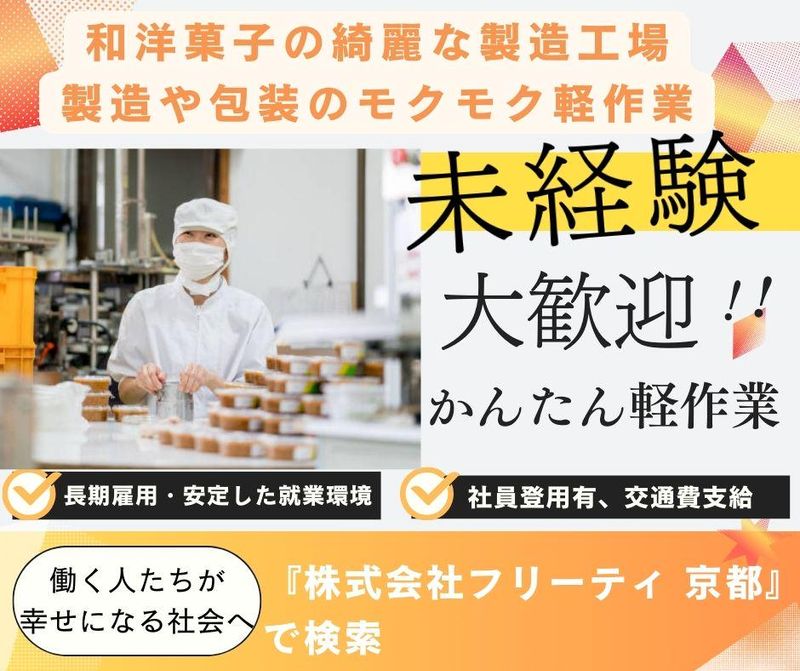 仕事内容 マドレーヌ、フィナンシェ、最中、ゼリーなど、 和菓子や洋菓子の製造と包装・出荷のお仕事をおまかせします✨ 【具体的には】 ✅製造工程では和菓子・洋菓子、ゼリーの仕込み作業(生地練り)やトレイの入れ替えを行います ✅包装・出荷工程では、袋に詰めいく作業と出来上がった商品を出荷する一連のライン作業となります。 ✅モクモク作業が簡単でシンプルなので、すぐに覚えられます✨ ※初めての方でもすぐに初められるシンプルで簡単な作業!! == 入社後は == まずは簡単な業務から! 先輩に教えてもらいながら簡単な補助業務から覚えていけばOKです! 先輩の補助業務を通して流れを身に付けていきしょう!
