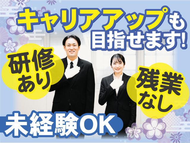 仕事内容 未経験から冠婚葬祭アドバイザーへ! ゆくゆくは幹部候補も目指せます! 景気に左右されない仕事だから長期安定で働けるのが魅力です。 【 安心の勤務環境 】 ・未経験から正社員採用 ・残業ほぼなし ・週休二日制 【 冠婚葬祭アドバイザーとは 】 会員様の疑問や相談にお答えしたり、 お客様のライフパートナーとしてサポートを行います。 《 主な仕事内容 》 ・ブライダル、セレモニー施行打ち合わせ ・会社宣伝PR活動 ・イベント企画および提案営業 ・会員様へイベントのご案内 冠婚葬祭の知識は入社後に身につければ大丈夫です。 研修期間中に冠婚葬祭のマナー・基礎知識を丁寧にお教えします。 研修期間後は徐々にひとり立ちを目指すため、いきなり一人で対応することはありません。 未経験からゆっくり覚えていきましょう! 《 入社後の流れ 》 座学研修(冠婚葬祭マナー・基礎知識等) 現場研修(打合せ同席など) 研修終了 "徐々に"独り立ちを目指せる! (いきなり一人対応にはなりません!) 先輩スタッフが丁寧にお教えするので、初心者さんも安心です。 当社ではイチから学べる環境をご用意しています。 《 未経験スタートでもキャリアアップが可能! 》 能力や適性により、リーダーやマネージャー職へ昇格することも。 異業種からの転職、未経験からのスタートも応援します! ~ 冠婚葬祭のお仕事とは ~ お客様のライフパートナーとして、 分からないこと、不安なことをひとつひとつ解消していく大切なお仕事です。 冠婚葬祭はどなたも経験が少ないのが当たり前。 「結婚式をするのにどのぐらいかかるの?」 「お葬式って何をすればいいの?」 など、会員様の疑問や相談にお答えし、不安を解消していきます。 会員様一人ひとりに寄り添い、大切な時間を創るお手伝いをするお仕事です。 ~ 当社では ~ 40代・50代の男女が多数活躍している職場です! ミドル世代の方も元気に活躍しています。 前職問わず、イチからスタートしたい方もご応募お待ちしております!