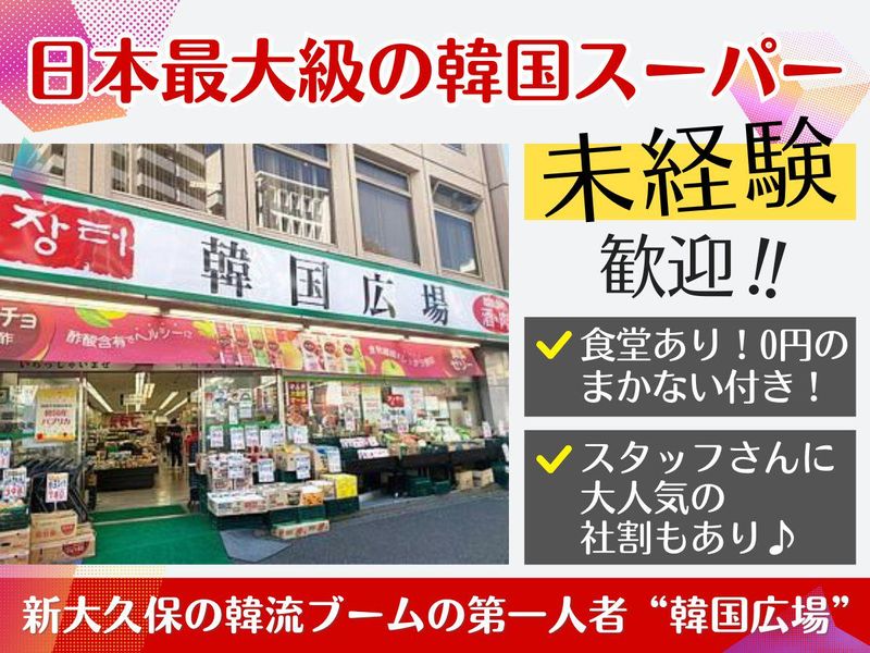 仕事内容 韓国食品スーパーにて、 レジ作業・陳列作業をお願いします。 〇体を動かしながら働きたい方に必見! 〇接客未経験の方でもOK! 〇20代~30代の若い層を中心に活躍中! お店に来店されるお客様も温かくて 接しやすい方が多く、 店内はとても和やかな雰囲気です。 常連さんが来店されると、 「〇〇さん、今日もがんばってるね!」 と声をかけてくれることもあります! ================== << 韓国広場のご紹介 >> 韓国広場は韓国の食、文化、心を届けます。 東京・新大久保の韓流ブームの第一人者! 韓国広場は韓国の生活文化をサポートする 日本最大級の韓国スーパーです! 韓国食材の大半を韓国から直輸入! また、韓国食材のみならず、 韓国の食器や生活用品など 幅広いラインナップを揃えています。