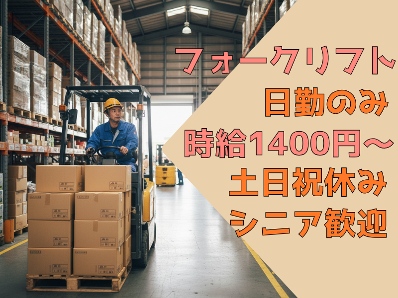 求めている人材 《 フォークリフトの有資格者 》 リーチフォークリフト、カウンターフォークリフトなど種類を問わず、フォークリフトオペレーターの経験があれば尚可 資格はあるけど実務の経験はない、ブランクがある方も大丈夫です。 ・長期でできる安定したお仕事をお探しの方 ・フルタイムでガッツリ働きたい方 ・高時給でシッカリ稼ぎたい方 ・土日はお休みがいい方 一つでも当てはまる方はぜひご応募ください。