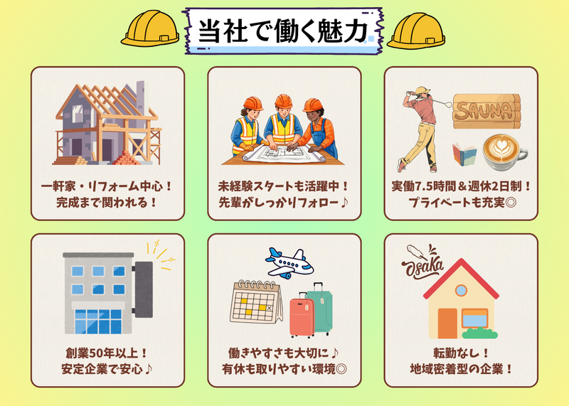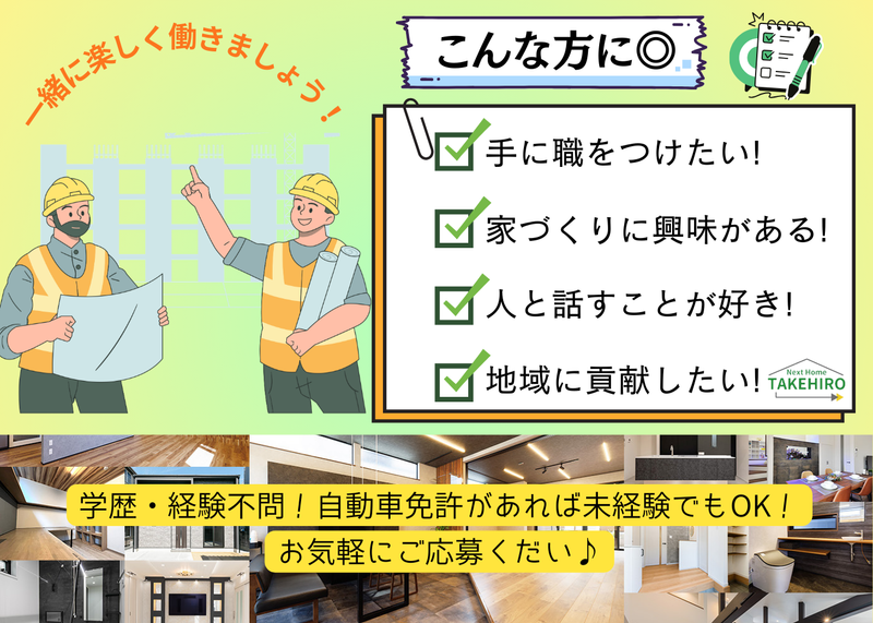 選考プロセス 新築・リフォームのご依頼増加に伴い、体制強化のため増員募集を行います。 今後は若手メンバーを中心に、さらに活気ある職場づくりを目指しています。 未経験の方はイチから丁寧にサポートしますのでご安心ください。 経験者の方は、これまでのスキルを活かし即戦力として活躍できる環境です。 ぜひ私たちと一緒に働きましょう! 【選考フロー】 書類選考 → 最終面接 → 内定