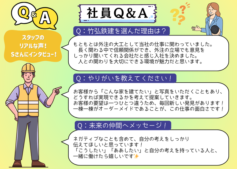 仕事内容 \\新築・リフォームの施工管理// 地域の暮らしを支える家づくり。未経験も経験者も大歓迎! ✅竹弘鉄建とは...? 50年以上の歴史を持つ地域密着の住宅建築会社です。 パナソニック耐震住宅工法「テクノストラクチャーの家」を取り入れ、 強くて快適な一軒家の建築やリフォームを通して、 お客様一人ひとりの暮らしやすさ・安心な住まいづくりを支えています。 ✅当社で働く魅力 ✨一軒家・リフォーム中心!完成まで関われてやりがい実感! ✨未経験スタートも活躍中!先輩がしっかりフォロー♪ ✨実働7.5時間&週休2日制でプライベートも充実◎ ✨創業50年以上の安定企業で安心♪ ✨長く働く人が多い職場!有休も取りやすい環境◎ ✨転勤なし!地域密着型の企業! ✨家づくりの知識が身につく!一生モノのスキルに! ✅SNSも投稿中! ================== *HP/Instagram/X/facebook 『竹弘鉄建』で検索♪ ================== ✅仕事内容 一軒家やリフォーム工事を中心とした、施工管理(現場サポート)のお仕事です! ≪具体的な仕事内容≫ ■現場のスケジュール確認・進捗チェック ■職人さんとの打ち合わせ・作業の段取り ■工事写真の撮影・簡単な記録作成 ■材料の手配・数量確認 ■工事が図面通りに進んでいるかの確認 ■現場の整理・安全確認 など ≪未経験でも安心ポイント≫ 「現場をまとめる仕事って難しそう…」と思われがちですが、 “人と話す・段取りを考える”ことができれば大丈夫! まずは先輩と一緒に現場に入り、 図面を見ながら建物の仕組みや仕事の流れを少しずつ覚えていきます。 慣れてきたら、資材の発注や職人さんの手配、品質チェックなどの 施工管理業務にもチャレンジ! 未経験の方も安心して成長できる環境です✨ ✅社員インタビュー!【*施工管理/Sさん】 ■入社のきっかけは? もともとは外注の大工として当社の仕事に関わっていました。 当時は個人事業主として設計の仕事もしており、「昼は大工、夜は設計」という生活をしていました。 注文住宅は、人との関わりがとても大切な仕事です。長く関わる中で信頼関係ができ、「この会社で働きたい」と思い入社を決めました。 ■竹弘鉄建を選んだ理由は? 一番の理由は、「話をきちんと聞いてくれる会社」だと感じたことです。 多くの工務店では元請けと下請けの立場がはっきりしていて、意見を伝えても受け入れてもらえないこともあります。 しかし当社は、外注業者の立場でもしっかり意見を聞いてくれました。そこが他社との大きな違いだと感じ、入社を決めました。 ■入社して感じたことは? 2020年に入社し、現在6年目になります。 入社して感じたのは、自分の意見を持って仕事ができる環境だということです。 社長はきちんと話を聞いてくれ、良いことも改善点も率直に伝えてくれます。 立場に関係なく意見を言える雰囲気がある会社だと感じています! ■現在の仕事内容は? 新築住宅の設計・見積もり・施工管理を担当しています。 営業が受注した後は施工管理が中心となり、設計完成後に工程を組み、発注や現場管理を行います。 住宅はおよそ4ヶ月ほどで完成します! ■やりがいは? 他社では難しいような案件を任されることも多く、そこにやりがいを感じています。 お客様から「こんな家を建てたい」と写真をいただくこともあり、どうすれば実現できるかを考えて提案していきます。 お客様の要望は一つひとつ違うため、毎回新しい発見があります! 一棟一棟がオーダーメイドであることが、この仕事の面白さだと思います。 ■大変なことは? 近隣対応など、予想外の出来事が発生することもあります。 ただし代休はしっかり取得でき、施工管理としては残業時間も比較的少なく、働きやすい環境だと思います。 ■職場の雰囲気は? 一言でいうと温かい雰囲気の職場です。 話しやすく、意見も言いやすい環境だと感じています! ■未来の仲間へメッセージ! ネガティブなことも含めて、自分の考えをしっかり伝えてほしいと思っています! 「こうしたい」「ああしたい」と自分の考えを持っている人と、一緒に働けたら嬉しいです✨