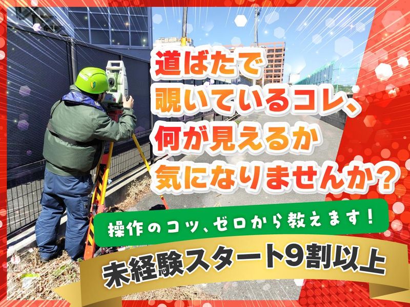 仕事内容 *タイピングやExcel使用など 基礎的なPCスキルがあればOK! *活躍中のスタッフも9割以上が 未経験スタートの会社です *資格習得支援制度あり! 通信教育の受講料全額会社負担! 資格取得者には手当支給で手取り増✨ →最大1資格で月給+90,000円 *土日、祝日休みの完全週休二日 有給取得率平均97%! *賞与は年2回 昨年度実績:計8.6ヶ月分支給✨ ――――――― 先輩社員が担当する測量現場での業務や データをまとめ、成果作成を行うデスク業務の 補助、サポートをご担当いただきます。 測量や現場作業が初めての方も大歓迎! 基本現場は2-3名で担当するので まずは見て覚える、やってみて覚えるという 過程を踏める環境です。 ――――――― 当社では公共測量や一般測量だけでなく、 工事測量や3Dレーザースキャナーを用いた三次元測量など、 幅広い業務に携わることができます。 現場は空港、道路、トンネル、法面、構造物など多岐にわたり、 チームで協力しながら計測から成果作成までを行います。 【主な業務内容】 ◆GNSS測量 →地球規模での正確な場所・座標の特定 ◆トータルステーションによる測量 →特殊な機械による鏡の反射を利用して 「距離」と「角度」をミリ単位で計測 ◆3DレーザースキャナーやUAVによる三次元測量 →地形や建物の形をまるごと計測 ◆CAD図面作成や点群データの整理・解析 →スキャナーで録った大量の点と点を繋げ 線を引き、平面図と呼ばれる地図を作成 ◆4足歩行ロボット(Spot)を用いた自動計測 →ロボットに、スキャナーを背負わせて計測 操作やデータの確認を人間が行う …と一見すると専門的な業務が多め。 作業自体はシンプルなものもありますが 未経験の方々は、まず先輩たちの業務の流れを見ながら どういった計測を行っているのか そのデータがどう活用されているのか を見てみてください。 ――――――― 現場では、常に限られた時間の中で どれだけ正確に、求められているデータを計測できるか の勝負が行われているような状態です。 同様の業務の経験は現場でないと積めないものになりますので 希少価値の高いスキルや経験を身に着けることもできます。 手に職をつけて働きたい 長く活躍できる業界にチャレンジしてみたい と考えお仕事を探している方には ピッタリな環境です。