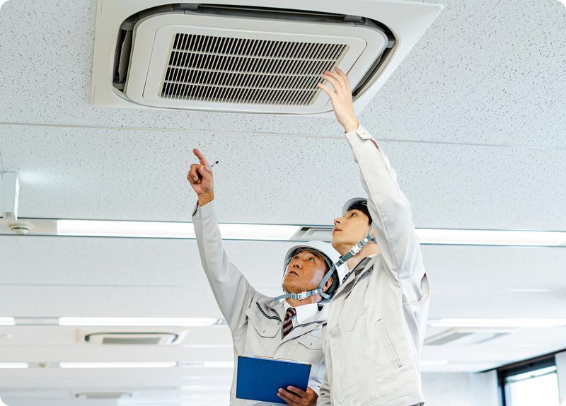 業務用空調の工事を行う現場作業員