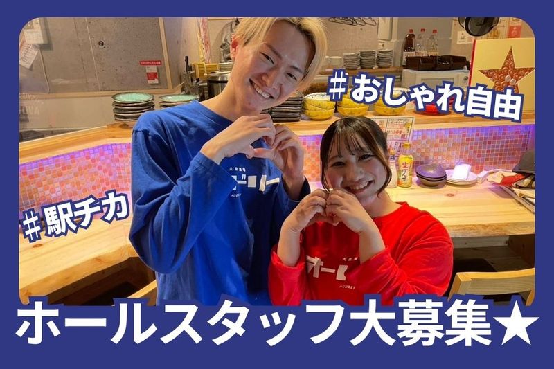 仕事の内容 / NEWスタッフ大募集☆ \ <<オススメPOINT>> ━━★オシャレ自由 可愛くカッコよく働けるッ! 髪色・ネイル・ひげ・ピアス…全て自由! 自分らしく働けるって、スタッフからも大好評! ━━★馴染みやすさ抜群! フレンドリーなスタッフばかりなので、 初日から馴染めちゃう~♪ ━━★シフト融通抜群! 週2日~&3h~OK 学業優先◎かけもちバイトOK プライベートも充実しながら働ける! ━━★初バイト大歓迎! 「飲食店で働いたことがない」 >>そんな方も大丈夫◎ イチから丁寧にお教えするのでご安心を♪ ━★履歴書不要! 履歴書不要なので事前準備一切なし! Wお気軽にご応募くださいね◎ 【仕事内容】 ・席へのご案内 ・オーダー取り ・料理、ドリンクの提供 ・レジ etc. まずは明るい笑顔でお客様をお迎え♪ ひとつひとつ丁寧に教えていくので、 未経験さんもご安心くださいね◎