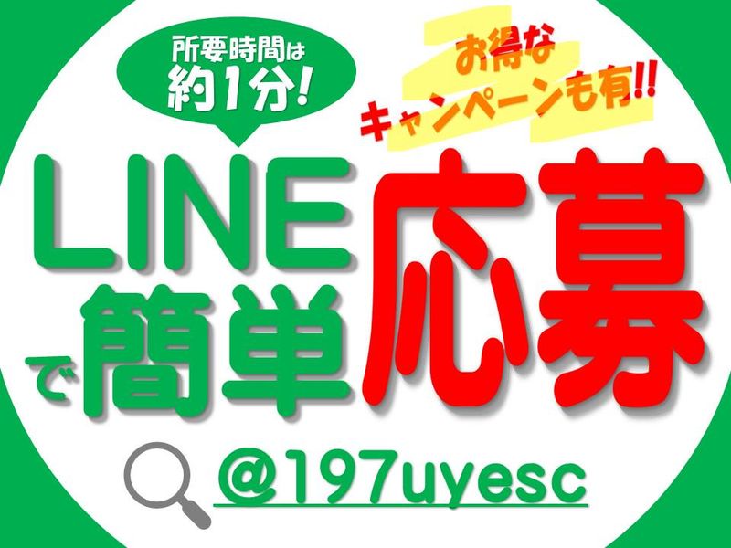 選考プロセス TEL:03-6775-4447 TEL応募OK(登録一切不要で面接設定可) 1.応募(LINEからの応募もOK) 2.担当者より面接日程の調整などご連絡 (LINE応募の場合は応募と同時に面接日予約ができます) 3.面接実施※履歴書不要 4.入社手続き等 ※今すぐの転職が難しい方も調整のご相談可 ※面接は「大宮/赤羽/神田/中野/立川/横浜など」でも対応可 レンタルオフィス契約中の為、関東一円どこでも面接可 LINE ID:@197uyesc ※登録後、応募の旨を一言ご連絡いただければ折り返し致します