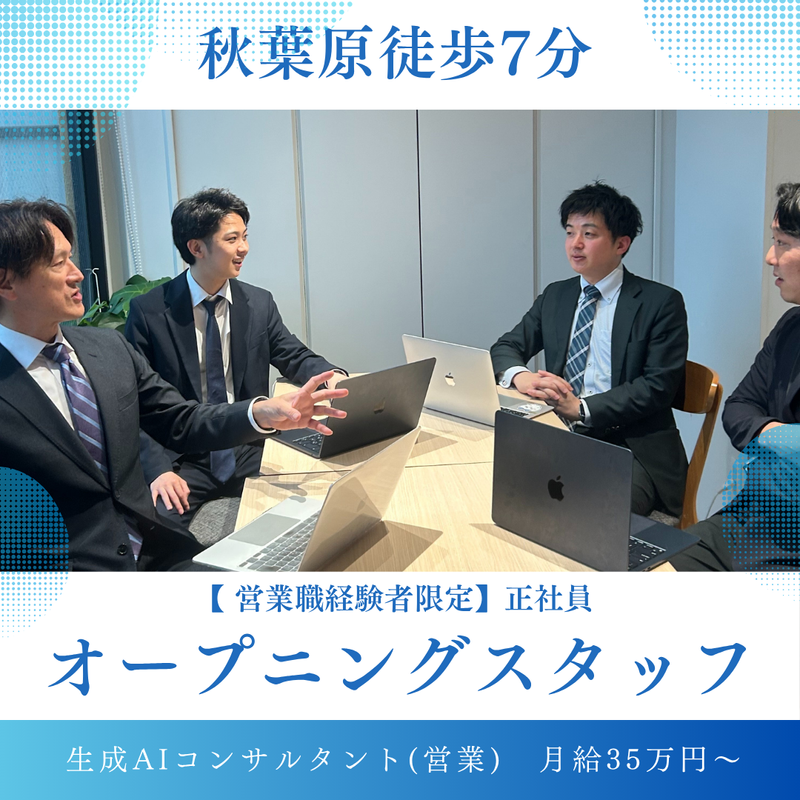仕事内容 ✨20~30代活躍中!✨ ✨若手が輝いている会社です✨ 「成果を出しているのに、若いからって 役職や新しい仕事を任せてもらえない」 そんな歯がゆい思いをお仕事で感じたあなた!必見です! 年功序列ではなく、成果を評価します! 当社では、20~30代のみ活躍中で、 同世代の仲間が欲しいと思っている方にピッタリです★ \\✨求人のアピールポイント✨// ~~~~~~~~~~~~~~~~~~~~ ✅急成長の会社の東京支店オープニング! オープニング社員として勤務できる ✅上場準備中の成長企業で働くチャンス! ✅生成AIという成長業界でスキルを磨ける ✅ZOOMを活用したオンライン営業 ✅スタートアップで経営視点で動ける! ✅副業やフレックスなど柔軟な勤務体系 \\✨こんなあなたにマッチ✨// ✅営業の経験を生かした仕事をしたい! ✅20~30代活躍中! 同世代の仲間に囲まれ働きたい! ✅キャリアアップを目指したい! ✅成長業界(生成AIやチャットGPTなど)の 知識を得ながら働きたい! ⏩仕事内容  ̄ ̄ ̄ ̄ ̄ ̄ ̄ ̄ ̄ ̄ ̄ ̄ ̄ ̄ ̄ ̄ ̄ ̄ ̄ ̄ 生成AI研修やeラーニングシステム AI開発などの法人向け提案営業です。 業務改善やコスト削減など、お客様にとって は急務な要望に、近年注目が高い生成AIや チャットGPT等を用いたソリューションで 提案~解決まで伴走します✨ 「意味ある提案」ができるのが弊社サービスの魅力です! 営業職はやってきたがコンサル未経験の方、 AIの使い方がわからない方も大丈夫◎ BtoBで企業の課題に向き合う仕事なので、 お客様の課題を引き出すスキルが生かせます。 今回は支店のオープンに伴いスタートアップ メンバーを大募集! 若いリーダーと一緒に立ち上げの楽しさを 味わいませんか? 人数が限られるため早めの応募をお願いします。 ⏩具体的な仕事内容  ̄ ̄ ̄ ̄ ̄ ̄ ̄ ̄ ̄ ̄ ̄ ̄ ̄ ̄ ̄ ̄ ̄ ̄ ̄ ̄ ●AIに興味がある顧客への案内 (リード獲得※新規架電は別組織が担当) ●アポイントにて顧客ニーズのヒアリング ●提案資料作成/クロージング ●導入後の講師や開発チームとの連携 ●営業フローや仕組みの改善提案 ✨チームで取り組む営業スタイル  ̄ ̄ ̄ ̄ ̄ ̄ ̄ ̄ ̄ ̄ ̄ ̄ ̄ ̄ ̄ ̄ ̄ ̄ ̄ ̄ Zoomを活用したチーム型営業が基本です。 朝晩のチーム会や提案設計など、 社内メンバーとの協業がベースにあり、 成功体験はみんなで共有し、創業から 全体で売上を伸ばしてまいりました。 チームみんなで達成感を得たい!という方に 向いている仕事です◎ ✨立ち上げ期ならではの成長機会  ̄ ̄ ̄ ̄ ̄ ̄ ̄ ̄ ̄ ̄ ̄ ̄ ̄ ̄ ̄ ̄ ̄ ̄ ̄ ̄ 5期目に入りましたがまだまだ 立ち上げフェーズならではの 「仕組みを一緒に創る面白さ」 も体験できるポジションです。 自己成長と社会貢献の両立を目指しながら キャリアを築いてみませんか? ⭐・・・……――――……・・・⭐ 株式会社MoMoについて ⭐・・・……――――……・・・⭐ 当社は福岡を拠点に、生成AI技術を 活用した革新的なサービスを 展開している企業です。 現在、上場に向けた準備を進めており 成長著しいフェーズにあります。 いろんな経歴を持った前向きなメンバー が多い職場なので、イキイキとした メンバーと一緒に前向きな気持ちで 働きたい!というかた、大歓迎です! 「社会に価値を届ける」という 強い使命感を共有するメンバーと共に さらなる事業拡大を目指しましょう✨ ⭐・・・……――――……・・・⭐ 同じ職種の仲間について ⭐・・・……――――……・・・⭐ 現在活躍しているのは20代~30代の 社員のみ! 職場は同世代同士で和気あいあい。 転職がほとんどなので、入社後の フォロー体制が整っています! 今回は東京支店のオープニング! 若いリーダーと一緒に、 新しい環境で新しい仲間と 立ち上げをしてゆく楽しさがあります!