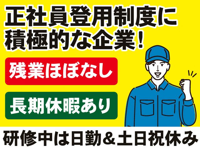 仕事内容 【オススメのポイント】 ・正社員登用に積極的な企業 ・残業ほぼなし(月5h程度) ・年間休日122日 ・20代~40代前半の男性活躍中 <お仕事の内容> 部品のセット作業 加工機に部品のセットや取り外し作業 出来上がった製品の外観検査、寸法確認などを行います。 (立ち作業です) あつかう部品はレコード盤程度の大きさです。 ※作業中は手袋を着用します。 まずは日勤固定(土日祝休み)で研修スタート。 工場勤務が初めての方も仕事に慣れられるようにフォローいたします。 <働く環境について> 空調完備の快適な環境です。 作業を習得したら、しっかり稼げる2交替シフトに移行! 嬉しい長期休暇ありで、プライベートも充実! 休憩時間は食堂、休憩室(椅子テーブルあり)で ゆっくりと過ごせます。 仕出し弁当の注文、弁当持ち込みも可能です。 食事時間の外出OKなので、近隣のコンビニを 利用する方もいらっしゃいます。 マイカー内での休憩もOK! 作業服は一式無償貸与いたします。 ガラス製品を扱うため、作業中のピアスや アクセサリーは基本的にNGですが、 結婚指輪やネックレスなど作業服で 隠れる程度はOKです。 <正社員登用制度あり> ゆくゆくは長期安定で働きたい、 キャリアアップをお考えの方にもオススメ! 正社員登用制度を積極的に行っている就業先です! <週払い制度あり> お給料日前でも安心! お気軽にご相談ください。
