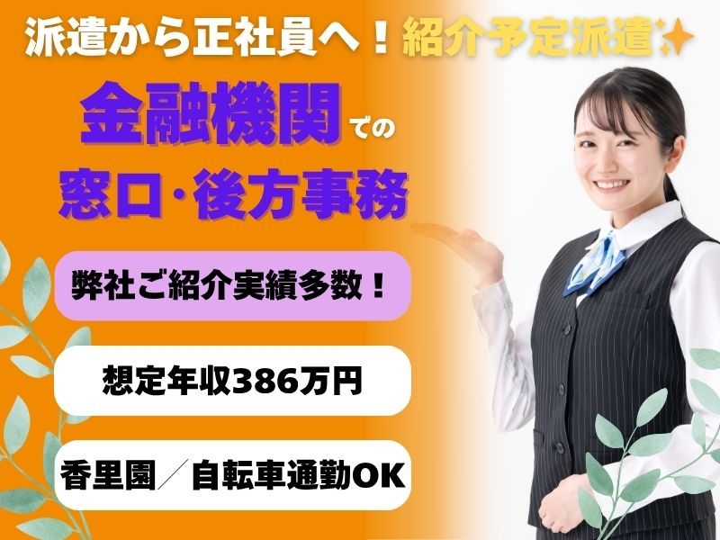 金融機関で窓口 後方事務/賞与あり/完全週休2日制/社会保険完備/紹介予定派遣/枚方市/fQ5095hT