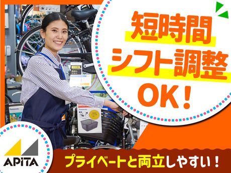 仕事内容 ◆仕事内容 \\この求人のPOINT// *都合に合わせて働ける短時間勤務! *経験不問!専門知識がなくても大丈夫! *育児などプライベートへの理解ある職場! *majicaポイント還元などの福利厚生充実! *髪色自由!好きなスタイルで働けます! 【仕事内容】 自転車の陳列・管理・販売を始め、お客様からの質問に答えたり、パンク修理や点検の受付など自転車に関わるお仕事をお任せします!サイクルショップ経験者、自転車・ロードバイクが好きな人・未経験者も歓迎!自転車安全整備士の資格取得に向けてお仕事中に訓練ができます♪ ~具体的には~ *商品の陳列・補充 *在庫管理 *接客 など //////////////// <電話でのお問い合わせ> 0120-156-283(採用担当)まで //////////////// <サポート体制> 最初はわからないことが多いと思いますが、独自の教育システム「PPIHカレッジ」があるから大丈夫!マニュアルに沿って、初日で一通りの業務内容が理解できるようになっています。その後は、先輩と一緒に実務を経験していくOJTを通して、少しずつできることを増やしていきましょう♪ <未経験スタートの先輩多数活躍中> 「接客をしたことがないから…」という方でも大丈夫です!今働いている先輩の多くが未経験スタート。新人さんはこういったところに困りがちといった、自分の経験に沿ってサポートに入ってくれるので、未経験の方もブランクがある方もスムーズに始められます◎ <ただのスタッフではありません> パート・アルバイトのみなさんに対して、一緒に働く「仲間」という強い思いがあり、その意味も込めて「メイト」さんと呼んでいます。小さなことかもしれませんが、私たちにとっては重要なこと。仲間を大事にする文化が根付いているからこそ、働きやすい職場づくりに力を入れています! パートデビューも大歓迎♪ 家事や子育てに専念してきた方の久しぶりのお仕事再開も大歓迎です。生活に密着した品物を扱うスーパーでのお仕事なので、あなたの日頃の家事育児の経験が存分に活かせるはず♪仕事帰りに買い物もませられるので時間も有効活用できちゃいます。 働きやすさのヒミツ♪ 店舗を運営している会社には基盤がしっかりした歴史ある労働組合があります。https://www.aulu-info.org/「“ここ”で働いていて良かった」と実感できる職場づくりのために、一人一人の声を会社に伝えて協議をし、労働条件や職場環境の改善・向上をはかっています。風通しの良い環境なので、安心して働けますよ! 仲間が優しくフォロー♪ 店舗内では老若男女、ライフステージも様々な人がたくさん働いています。同年代の仲間はもちろん、ベテランスタッフや人生の大先輩もたくさんいる環境はパートデビューにぴったり。わからないことはなんでも聞いてください!難しい仕事はないので、すぐに慣れて楽しく自分らしく働けますよ♪ ユニーについて 衣・食・住・余暇にわたる総合小売業として、大型総合スーパーのアピタ、小型総合スーパーのピアゴなどを東海エリアを中心に関東・北陸・近畿エリアに展開しています。日本最大級のディスカウントストア"ドン・キホーテ"を有するPPIHグループの一員として、更なる進化を目指しています。