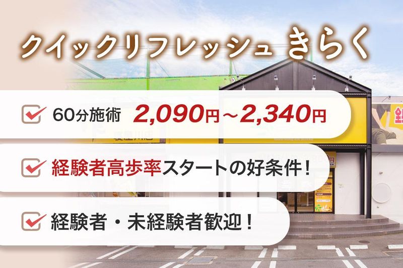 仕事内容 ─────[おすすめポイント]────── ★選べる働き方!日数・曜日相談OK! ★経験者技術チェック後、即日勤務可能! ★登録料2,000円/1店舗で系列店Bフィット ネス使い放題! ────────────────── ~ ココロとカラダを気楽に リフレッシュがテーマの⼈気サロン~ 『クイックリフレッシュ きらく』では セラピストのスタッフを募集しております 専門の技術を用い お客様に心のこもった癒しを提供する、 とてもやりがいのあるお仕事です そんな「きらく」で一緒に働きませんか? 完全歩合制◆働いた分だけリターン!  ̄ ̄ ̄ ̄ ̄ ̄ ̄ ̄ ̄ ̄ ̄ ̄ ̄ ̄ ̄ ̄ ̄ 売上の55%~61.6% 60分施術 2,090円〜2,340円 あなたの技術と心遣いが そのままお客様の満足と 収入につながります ******* ▼ 仕事内容 ▼ ******* <施術メニュー例> ・もみほぐし ・リフレクソロジー(足つぼ) あなたの技術でお客様に 安らぎと最高のひと時を ご提供してください ────────────── 専用の技術スクールあり ────────────── ~無料で丁寧な技術指導が受けられる~ ▶技術の不安を解消! ・一度に全部を覚える必要はなく できる内容から順番に身につけられるので 最初はできなくても講師と一緒に乗り越え られます ▶デビューの不安を解消! ・接客を想定した練習を繰り返すので 不安なままデビューする事はありません ー ※講習期間:1日~30日前後