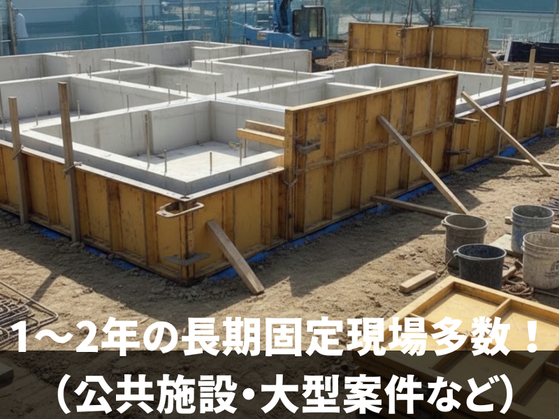 仕事内容: 「形に残る、記憶に残る。」 大型プロジェクトを支える職人募集 病院や商業ビル、公共施設などのコンクリート建造物をつくる際、その「器」となる「型枠」を組み立てるお仕事です。 【型枠(かたわく)とは?】 鉄筋コンクリートの建物を建てる際、固まる前のコンクリートを流し込む「型」のことです。 パズルのように木板を組み立て、コンクリートが固まったら外す。 建物の形を決める、非常に重要でやりがいのある工程です。 【具体的な仕事の流れ】 1.加工: 図面に合わせてパネルなどの資材を加工します。 2.墨出し: 現場で型枠を立てる場所に印をつけます。 3.建て込み: 加工した資材を現場で組み立てて固定します。 4.解体: コンクリートが固まった後、型枠を取り外します。