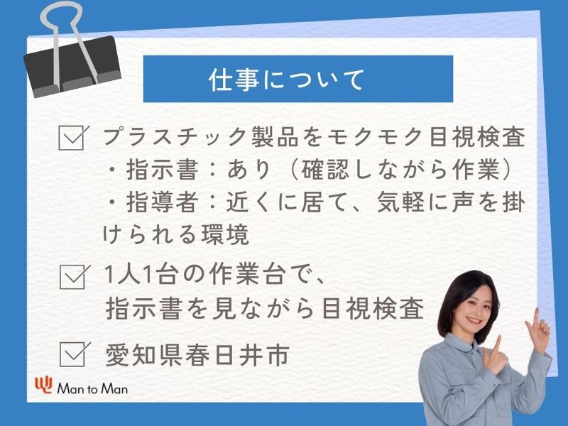 求める人材: 【応募資格】 ・経験不問 ・検査業務で細かいキズをチェックする 業務なので、視力が0.7以下の方 (※視力矯正は問題ございません) 乱視や老眼がありボヤけて見える方 などはご提案が難しい場合がございます。 / 派遣先では未経験から スタートした方もたくさんいます。 \ ーーーーーーーーーーーーーーーーーーーー Man to Manでは他にも以下の様な スタッフさんが活躍されています。 ・異職種から転職された方 ・工場ワーク未経験の方 ・経験を活かしたい方 ・短時間/扶養内で働きたい方 ・女性活躍中の職場で働きたい方 ・20代、30代、40代、50代、60代 (若年層/中高年/シニア)活躍中の 職場で働きたい方 ・プライベートを充実させたい方 ーーーーーーーーーーーーーーーーーーー Man to Manには、 ハローワークや一般求人誌には掲載されて いないお仕事情報もたくさんありますので、 まずはお気軽にお問合せください。