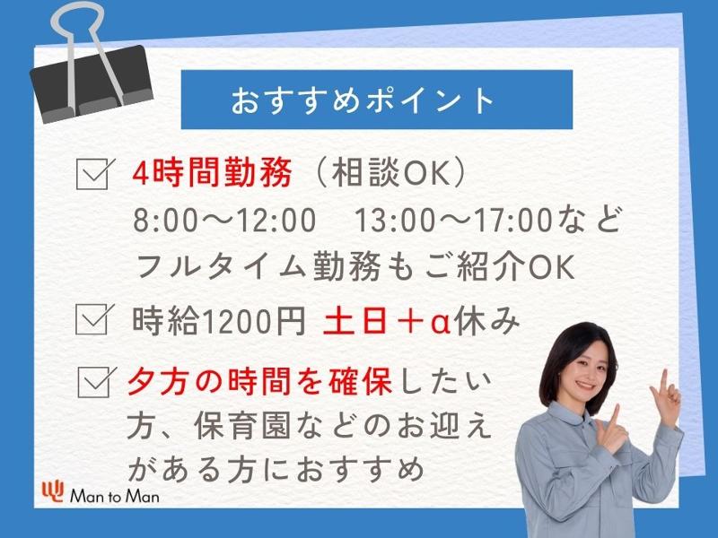 勤務時間・曜日: 【勤務時間】 ・4時間勤務 (相談OK:登録面談時にお教えください) 8:00~12:00 13:00~17:00 など フルタイム(8時間)勤務もご紹介できます♪ ・残業 ほぼなし 月10時間以内程度 【期間】 3ヵ月以上~長期 派遣社員から直接雇用 (正社員・契約社員等)の 実績多数あり! Man to Manでは毎年平均10~20名の方が 派遣社員から派遣先の直接雇用に 切り替わっています。