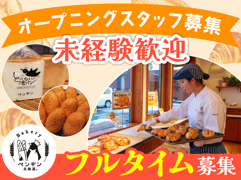 仕事内容 \横浜に4月新規OPEN!/ ✨未経験スタート大歓迎! ✨フルタイム募集! ✨研修後は社内規定で時給UPも! - 【仕事内容】 《製造》 ●生地の仕込み・成形・焼成・仕上げ ●サンドイッチの製造 など 《販売》 ●レジ対応などの接客 ●商品陳列 ●カウンターまわりの補助業務 など ================= ❖ 4月オープニングスタッフ募集 ❖ ================= みんな一緒のスタートで安心♪ 新しいお店をゼロから一緒に作れます! オープンの10日ほど前から研修を行うので、 接客未経験の方でも安心です◎ <ペンギンベーカリーについて> 2016年、北海道・恵庭市で誕生した ペンギンベーカリー。 「安心・安全で美味しいパンを届けたい」 という想いから、道産小麦を使い、職人が 一つひとつ心を込めて焼き上げています。 SNSやメディアでも話題沸騰中で、 日本カレーパン協会主催の 「カレーパン グランプリ」では5年連続金賞を受賞! 全国的にも注目される人気ベーカリー ブランドです✨ ==================== ❖ 週休2日か3日を選べる勤務スタイル ❖ ==================== 当社では“フルタイム勤務”を基本と しながらライフスタイルに合わせて 《週休2日》と《週休3日》のどちらかを 選べる働き方をご用意しています。 週4日勤務(週休3日)なら、負担を 抑えつつフルタイムとしてしっかり 働けて、仕事の流れや成長実感も得やすい メリットがあります。 一方で、「もっと稼ぎたい」 「安定感を重視したい」という方は 週5日勤務(週休2日)もOK! フルタイムで安定した収入を得られるので しっかり収入を確保しつつ、無理なく 続けたいフリーターさんにもぴったりな 勤務スタイルです。 ==================== ❖ こんな方にオススメのお仕事です ❖ ==================== ・焼きたてパンの香りに囲まれて働きたい ・新店舗の立ち上げに関わってみたい ・しっかり働いて安定した収入を得たい ・プライベートの時間も大事にしたい ・接客が好き、人と話すのが好き ・コツコツ作業も楽しめる ・未経験からパン屋で働きたい ひとつでも当てはまる方は、きっと楽しく 働けます◎お客様とスタッフに愛される お店を一緒に作りましょう!