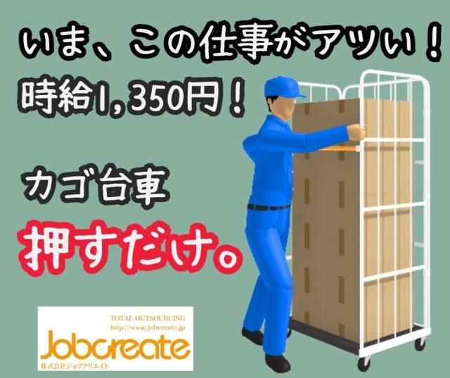 仕事内容 No.62605 ★高時給 ★定着率抜群 ★当社スタッフ14名在籍中! ★台車を運ぶだけのちょー簡単作業♪ ★髪色、髪型、ピアス完全自由♪ ★年間を通して温度が同じ倉庫 ★残業もほとんどなくプライベート充実♪ ★自転車・バイク通勤OK **-** \あの仕事がついに帰ってきた!/ 人気すぎてすぐ枠が埋まるんです。 この求人が今アツい!早い者勝ち♪ **-** ☆お仕事内容☆ 食品が載っているかご台車を仕分けエリアの数字が書かれている 決まった数字の場所まで運ぶだけのかんたん作業♪ 本当にこれだけ!? はい!これだけです!未経験もOKなのでまずはご応募ください♪ ◇職場環境◇ 冷蔵倉庫で今からの時期も涼しく仕事できます♪ 30代40代50代60代の幅広い方が就業されており 男性活躍中です!! ◇勤務形態◇ 【時間】 15:00~24:00 実働:8時間 休憩:60分 残業:ゼロ! ON/OFF分けれて、プライベートも充実♪ 【休日】 シフト制 土日出勤できる方大歓迎♪ ◇月収例◇ 週5日勤務の場合 1,350円×8H×22日=237,600円+交通費全額支給 ◇交通費◇ 全額支給 *公共交通機関の利用以外は 通勤距離により規定支給(バイク、自転車、徒歩) ◇アクセス◇ 大阪モノレール「摂津駅」徒歩8分 大阪モノレール「沢良宜駅」徒歩13分 阪急京都線「摂津市駅」徒歩17分 *バイク・自転車OK! *マイカー通勤もご相談ください♪ **-** ジョブクリエイトは 大阪府高槻市にある派遣会社です。 製造、倉庫内、梱包などの軽作業はもちろん オフィスワークや販売促進など 豊富な人材サポートを行っております! 阪急高槻市駅から歩いて3分♪ 来社不要のWEB面談も実施しております! ご希望の方はお気軽にお申し付けください☆ **-** <自宅から面接ができるWEB面接実施中> 来社不要のスマホ面接もございます! ご自身のPCやスマホでご自宅からかんたんに面接♪ <strong>*土日も24時間WEB面接対応します!!</strong> ▽WEB面接についてはこちら <a href="https://jobcreate.jp/faq/9553/">WEB面接は誰でも出来ますか?</a> <apアプリポイントプレゼント!> 日々のお仕事でポイントがたまり、 日用品や家電、食品、旅行券などの 商品と交換していただけます! ▽apアプリについてはこちら <a href="https://jobcreate.jp/smajob"/>社内連絡専用メッセンジャーアプリについて</a> ※土日祝日に頂いたご応募に関しましては、 翌営業日に順次対応させていただきます。 **-**