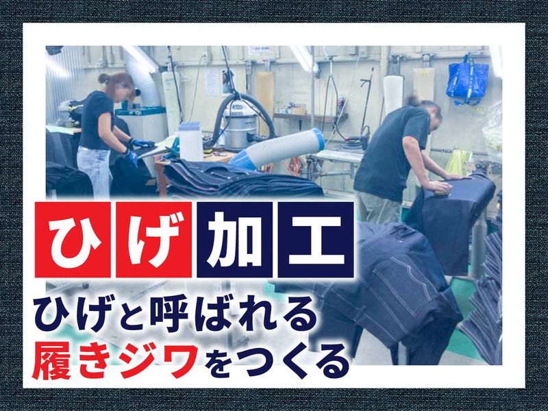 仕事内容 岡山デニムが世界から 評価されている理由は、 生地や縫製だけではありません。 ヒゲの入り方、 色落ちの濃淡、 ダメージの自然さ。 その一本の表情を決めているのが、 人の手による加工です。 今回募集するのは、 実際に手を動かしながら その“表情”をつくっていく 加工スタッフ。 同じ生地、同じ工程でも、 仕上がりは一本ずつ違う。 だからこそ岡山デニムには、 大量生産にはない価値があります。 ここは流れ作業の工場ではなく、 一本のジーンズと向き合う工房。 最初は、 やったことのない作業ばかりだと思います。 でも大切なのは、 「できない…」と止まることではなく、 「できるかわからないけど、やってみよう」 と手を動かしてみること。 その繰り返しの中で、 力加減や感覚が少しずつ身につき、 加工の技術として身体に残っていきます。 手作業だからこそ、 覚えた技術はその場限りで終わらず、 次の世代へと受け継がれていく。 未経験からでも、 好奇心を持って取り組める方なら大歓迎。 岡山デニムづくりの核心に、 一緒に関わっていきませんか。 ✄ – – – – – – – – – – 知識や経験は一切不問♪ ★ジーンズ製造の流れ★ (1)ひげ加工工程 擦ってひげを浮かび上がらせる ↓ (2)シェービング工程 太もも部分の色落ちを表現する ↓ (3)洗い工程 機械を使用して洗い作業 ↓ (4)ダメージ加工工程 座りながらの作業が中心 やすりの回転ローラーで 破きなどの”味”のある 加工を行います ↓ (5)仕上げ作業工程 余分な糸くずなどの除去をして 「できあがり」! ✄ – – – – – – – – – – 主に上記5つの工程のうち 【シェービング工程】を メインにお願いします◎ やすりや工具を使い、 太ももや膝の色落ちを 手作業で表現します。 生地の状態を見ながら 「どこを、どれくらい削るか」を考え、 削っては確認を繰り返す仕事。 最初は見本をもとに調整し、 慣れてくると自分の感覚で 自然な風合いをつくれるようになります◎ ✄ – – – – – – – – – – 慣れて独り立ちすればどの作業も ひとりでコツコツ×モクモク集中OK もちろん慣れるまでしっかり丁寧に ひとつずつレクチャーしていきます! 適度に身体を動かす作業も多いので 運動が好き・得意な方にもオススメ ✄ – – – – – – – – – – 【工場見学実施中!】 ▼事前に職場見学も可能です▼ まずはお気軽にご連絡ください