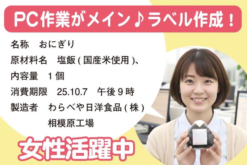 仕事内容 ✅未経験歓迎!お仕事簡単!女性2名活躍中! ✅安定の日勤勤務!車・バイク通勤可! ✅橋本&相模原駅から無料送迎バスあり セブンイレブン向けの商品を作る食品工場で おにぎりやお弁当などに貼られている 製造ラベルを作成するお仕事です! 主にパソコンを取り扱うお仕事ですが 簡単な操作のみなので未経験でも安心! 黙々と業務を進められるので、 コツコツ作業が好きな方にぴったりのお仕事♪ 初バイトや初アルバイトの方や 久しぶりのお仕事復帰の方も大歓迎です!