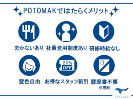 【保険制度】 雇用保険、労災保険、健康保険、厚生年金 待遇・福利厚生 【福利厚生】 ■昇給制度あり ■社会保険完備 ■交通費規定支給(月15000円まで) ■系列店スタッフ割引あり ■リファラル(紹介)報酬制度あり ■契約更新の可能性あり ■社員登用あり ■まかないあり ■制服一部貸与