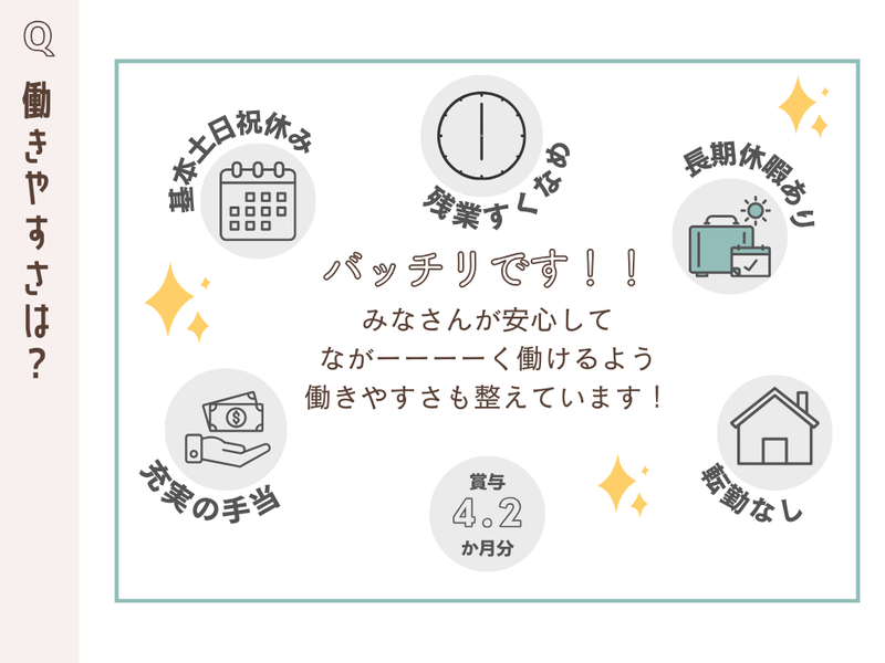 職場環境 \働きやすさ◎/ 「ずっとここで働きたい」と思ってもらえる職場づくりに 本気で取り組んでいます。 ✅子育て世代多数活躍中✨ ✅1時間単位有給で「ちょっと中抜け」も◎ ✅困った時は助け合い!チームワーク抜群◎ 喫煙所:喫煙所あり(屋外) 敷地内に喫煙スペースがございます。