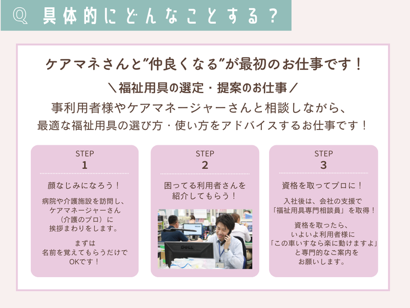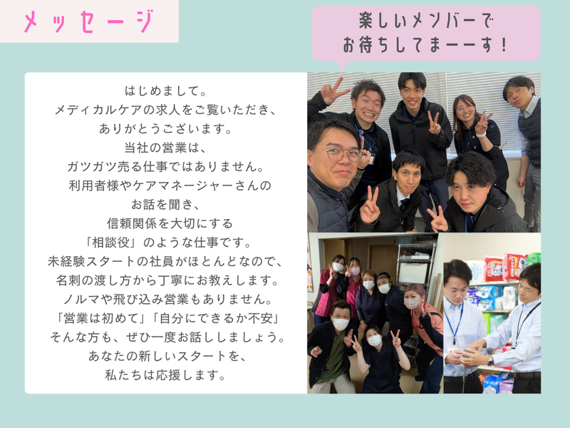 仕事内容 「ノルマがきつそう」 「未経験だとついていけないかも」 「ガツガツ売り込むのは苦手」 もしそう思っているなら、 当社の仕事は、あなたの想像とは まったく違うかもしれません。 私たちは 「売る」ことよりも 「信頼される」ことを大切にする会社です。 ✨未経験でも安心の理由✨ ✅ 「名刺の渡し方」から教えます 社会人経験が浅くても大丈夫。 ビジネスマナーから丁寧に研修します。 ✅ 飛び込み・テレアポなし 知らないお宅への訪問や 電話営業は一切ありません! ✅ チーム制でサポート 一人で放り出すことはありません。 先輩が必ず横について教えます。 ✅ ノルマ・自腹購入なし 数字に追われて精神的に辛い… なんてことはさせません。 ■具体的にお任せするのは… (”仲良くなる” が最初の仕事です) ┈┈┈┈┈┈┈┈┈┈┈┈┈┈┈┈•• 「モノを売る」より、 「困りごとを一緒に解決する」営業です。 介護施設で働く職員の方々から聞こえてくる 「もう少しラクにならないかな」 「こういう仕組みがあれば助かるのに」 ──そんな現場の声に耳を傾け、 一緒に悩みごとを解決していくのが、 私たちの営業スタイルです。 営業と聞くと 「モノを売ることがゴール」と思われがちですが、 私たちが大切にしているのは 「導入してよかった」と感じていただけること。 その言葉をもらえたとき、 きっとこの仕事をしていてよかったと思えます。 ◆具体的にはこんなお仕事です  ̄ ̄ ̄ ̄ ̄ ̄ ̄ ̄ ̄ ̄ ̄ ̄ ̄ ̄ 基本的は、 すでにお取引のある施設を定期的に訪問し、 日々の業務や困りごとをお聞きするところからスタートします。 最近では、 お問い合わせをきっかけに 新たなご縁が生まれることも増えています。 たとえば… 見守りセンサーやナースコール機器のご案内 └「夜勤が大変」「見回りの負担を減らしたい」といった声に、 IoT機器などでサポート。 車いすや福祉用具の点検・修理対応 └ 困ったときに頼ってもらえる存在として、 アフターサポートにも関わります。 専門知識は入社後でOKです! ゆっくり覚えていってください。 ⭐資格を取ってプロへ! 入社後は、会社の支援で 「福祉用具専門相談員」などの 国家資格取得を目指せます。 (費用は会社負担!) 資格を取ったら、いよいよ利用者様に 「この車いすなら楽に動けますよ」 と専門的なご案内をお願いします。 焦らず、じっくり一人前を目指せばOKです✨ ⭐最初の3ヶ月は… 先輩の運転する車の助手席に乗って、 まずは横でニコニコ話を聞くことから。 専門知識はゼロで大丈夫ですよ! ■「自分らしい働き方」を応援 (プライベートも大切にできます) ┈┈┈┈┈┈┈┈┈┈┈┈┈┈┈┈•• ✨休みの取りやすさ抜群! 「1時間単位」で有給が使えるので、 「今夜は友達とご飯だから1時間早く帰る」 「朝、役所に行ってから出社」 なんて使い方も自由自在です。 ✨奨学金返済もサポート 「お給料から返済するのが大変…」 そんな若手社員のために、 会社が返済を支援する制度があります! (※規定あり) ✨実家暮らしでも「住宅手当」 一人暮らしはもちろん、 実家から通う方にも支給されます。 毎月のお小遣いが増える感覚で みんな喜んでいます♪ ■正直にお伝えします (ぶっちゃけトーク) ┈┈┈┈┈┈┈┈┈┈┈•• ✅力仕事、あります! ベッドや車いすを運ぶので、 ちょっとした運動になります。 「ずっとデスクワークは眠くなる…」 という方には、 適度に体を動かせて気分転換になると好評! もちろん、重いものは チームで協力して運ぶのでご安心を。 ✅土曜出勤の場合もあり お客様の都合で土曜に出ることもありますが、 その分、平日に振替休日を取れます。 「平日の空いているお店に行ける!」 「銀行や病院に行きやすい」と メリットを感じている先輩も多いです◎ ■先輩たちの前職は? (9割が未経験スタートです!) ┈┈┈┈┈┈┈┈┈┈┈┈┈┈•• ・飲食店スタッフ ・アパレル販売員 ・工場の製造スタッフ ・フリーター など 「正社員は初めて」というメンバーも 今では立派に活躍しています。 あなたの「新しい一歩」を 私たちが全力で応援します!