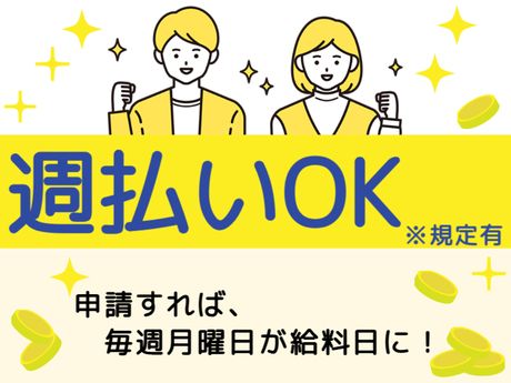 【保険制度】 雇用保険、労災保険、健康保険、厚生年金 待遇・福利厚生 【福利厚生】 ■社会保険完備 ■交通費全額支給 ■制服貸与 ■週払い可(規定) ■車通勤OK ■駐車場あり ■社員食堂完備 →安くてボリューム満点! ■男女別の更衣室あり ■冷暖房完備 ■ファン付ベスト貸出OK ■入社祝金10万円規定支給(規定あり) 12月末まで入社の方限定 ※1ヶ月勤務で2ヶ月目の給与と同じタイミングで満額支給