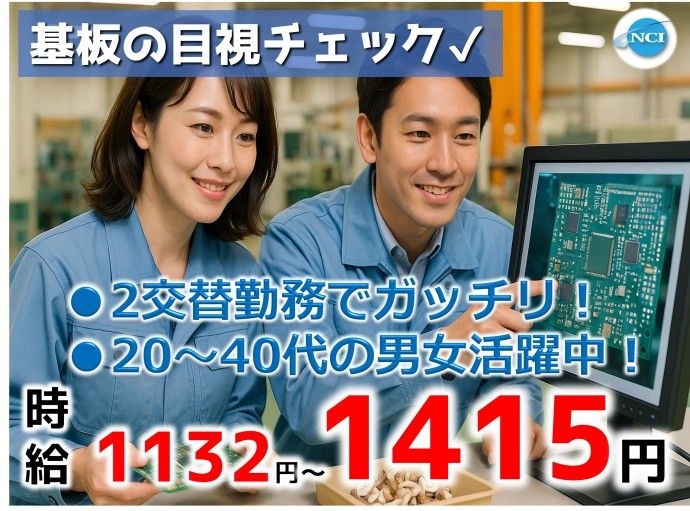 仕事内容 * 機械検査スタッフ募集中 * ━━━━━━━━━━━━━━━━━ 〇資格、経験ナシ!未経験スタートOK! 〇4勤2休でカガッチリ働ける! 〇20代・30代・40代の男女活躍中! ━━━━━━━━━━━━━━━━━ \製造工場スタッフ/ ◎PCやスマートフォン、テレビやエアコンなど 身の回りの電子機器に搭載されている プリント配線板の検査を行っていただきます。 ・機械に製品をセットしモニターに映し出された製品を 目視で印字が正しくされているか、キズや汚れなないか 確認する 〇製品は手のひらサイズの物が多く 女性の方でも安心してお仕事することができます! * オススメポイント * ━━━━━━━━━━━━━━━━━ 〇未経験からでもスタートできる製造工場! 〇4勤2休、9時間労働でガッチリ! 〇基本的には残業ナシで定時退社OK! 〇無料駐車場、冷暖房完備で働きやすい! 〇大手製造工場で長期安定のお仕事! 〇工場内は冷暖房完備で働きやすい! 〇ネイルOK(付爪NG)髪色自由! ━━━━━━━━━━━━━━━━━ * 求めている人材* / 未経験の方大歓迎! \ 〇男女活躍中! 〇20代・30代・40代・50代活躍中 〇資格や経験一切不問OK! 〇もちろん経験者も大歓迎! 〇モクモクコツコツ作業出来る方! ===ここもチェック!=== 〇長期 〇未経験OK 〇ブランクOK 〇フリーターOK 〇U・Iターン歓迎 〇第二新卒歓迎 〇交通費支給 〇車通勤OK 〇40代以上応募可 〇50代以上応募可 〇60代以上応募可 〇社会保険完備 〇正社員登用あり 〇各種手当あり 〇健康診断あり(年1回/会社負担) =================