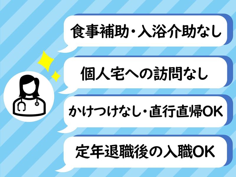 仕事内容 【⭐働きやすさ抜群 訪問看護サービス⭐】 - ✅個人宅への訪問なし&直行直帰可能 ✅オンコールなし・かけつけなし・残業なし ✅介護業務なし・夜勤なし・持ち帰り仕事なし ✅応募書類不要!書類選考はWebで完結 ✅75歳の採用実績あり!定年後も安心 ✅訪問看護未経験OK!主婦(夫) さん活躍中 ✅勤務週1日×短時間勤務! ✅Wワーク可・扶養控除内勤務可 - <業務内容> ■健康管理業務 ・入居者様の健康状態の確認 ・往診医との連携(指示の確認、状況の報告や相談) ・看護アドバイス(ケアスタッフへのアドバイス、支援) ※1週間先をイメージしつつケアを実施、アドバイスを行います。 ■利用者様への医療処置 ※必要と判断される場合に実施 ・足趾爪のフットケア(ほぼ全入居様に介入) 陥入爪、巻き爪、肥厚した爪、変形した爪、 糖尿病患者、白癬などの疾患のある方など。 ・排泄コントロール (下剤の調整、摘便、浣腸処置) ・創傷、褥瘡(床ずれ)処置 ・点滴、女性の膀胱留置カテーテル交換 ※稀に発生 看取りの方に水分を補うための点滴など。 プライベートを優先して働きたい方にピッタリ! <施設紹介> 当社は高齢者施設の入居者様への健康管理を目的とした看護サービスを提供中。 施設担当看護師として、施設のケアスタッフと連携しながらの勤務。 施設はアットホームな雰囲気で、 スタッフも親しみやすく長く働くことが出来る職場♪ ※グループホームとは~ 認知症高齢者の方々が共同生活を送っている施設です。 入居者数は、1ユニット(最大9名)構成となっております。 <⭐こんな方におすすめです⭐> ~✨スキマ時間で働きたい方歓迎✨~ 短時間の曜日固定勤務のため、家庭や子供の用事でお休み調整可! 「子どもの送迎で決まった時間に働きたい」 「子どもの帰宅時に家に居たい」 「介護と両立したい」 「家事と育児を両立したい」 「休日が勿体ない」…など。 生涯現役が叶う職場!! ~✨プラチナナース大歓迎✨~ 75歳の採用実績あり!定年後、ご入職された方が多数活躍中! 「定年後も看護師として働き続けたい」 「体力的に週1回で無理なく働きたい」…など。 結婚・育児・介護などを経て復職したい方にピッタリ! ~✨訪問看護が未経験でも安心✨~ 入職OJT研修あり!本社の看護師が2日間同行して しっかりサポートしますので安心です◎30代~70代まで幅広い世代が活躍。 勤務開始後は、看護相談窓口を準備! 安心して相談できる環境をご用意。 就業中に判断に迷った際もリアルタイムでバックアップ! <⏩よくあるご質問⏩> Q.事前に施設見学はできるのでしょうか? A.施設見学は行っておりませんが、 勤務開始前に担当施設で 研修をご用意しております。 実際の業務を行いながら お仕事に慣れていただきます。 Q.派遣ですか? A.紹介/派遣や単発のアルバイトではありません。 弊社の直接雇用です。 弊社の非常勤職員として 施設で勤務していただきます。 施設や入居者様との 信頼関係を築いていきながら、 長期で勤務していただける方を 歓迎しております! Q.Wワークは可能ですか? A.可能です。 ただし、同業他社とのWワークは 認めておりません。 (例:認知症グループホームへ訪問看護を 行っている事業会社や医療機関など) Q.年齢制限はありますか? A.年齢制限はありません。 30代~70代まで幅広い世代が 活躍しています。 プラチナナース大歓迎! もちろん主婦・主夫の方も大歓迎です!
