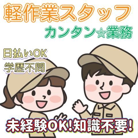 【大阪市西区】未経験者大歓迎!簡単・カーペット製品の軽作業スタッフ!日払いOK! ■未経験・初心者もできる簡単作業☆ ■経験・知識・スキル必要なし! ■長期・レギュラー勤務大歓迎! ■お友達同士の応募歓迎! ■応募のきっかけは何でもOK! ◆主婦(夫)・フリーター・学生活躍中! ◆男女未経験者大多数活躍中! ◆ご質問・ご相談のみも大歓迎! ◆日払い・週払いOK! ◆来社不要・簡単電話登録 ◆履歴書不要