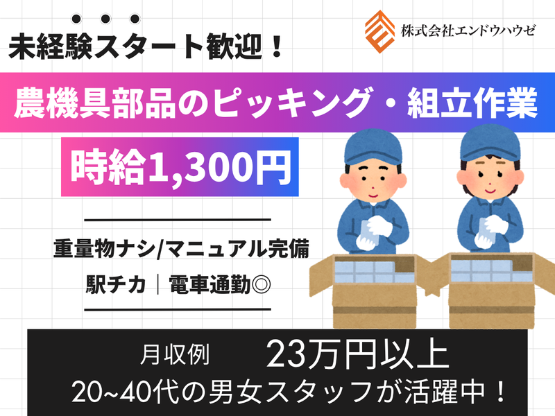 仕事内容 ◆おすすめポイント◆ ・未経験スタート歓迎:経験・資格は一切不問! ・安定の高収入:月収例23.4万円(時給1,300円×20日+残業代) ・日勤のみ&土日休み:生活リズムを整えたい方に最適 ・職場環境◎:20代~40代の男女スタッフ多数/和やかな職場 ・駅近:みどりの駅から徒歩15分/電車通勤OK \工場見学OKで安心スタート/ 農業機械に使用される部品を扱う、シンプルな倉庫内作業! 未経験から始めた方も多数活躍中!男女問わず20代~40代が中心の活気ある職場です。 ◆業務内容◆ 農機具(トラクター等)の製造に用いられる部品に関する軽作業です。 ・部品(ボルト・ナットなど)のピッキング ・ボルト締めなどの簡単な組付け作業 ※重量物なし/マニュアル完備/作業は一つひとつ丁寧にお教えします。 ※工場見学も可能。現場の雰囲気を見てからの就業判断でOKです。 ♦おすすめポイント♦ なんと今だけ!2026年2月末までの入社で入社祝い金5万円支給✨ <支給条件> ※2026年2月末までに入社の方 ※初回2ヶ月の契約期間の出勤率90%以上で5万円支給 ■見学◎ ■安心して始められる ■急募