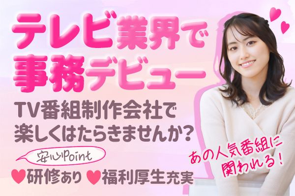 求める人材 必須:基本的なPCスキルのある方 ・学歴不問・経験不問です! ・未経験者歓迎! ・デスク経験者歓迎!お仕事ブランクOK! \こんな方、ぜひご応募ください!/ ◎テレビが好き、テレビ業界で働きたい ◎テレビ番組の裏側を知りたい ◎チームでモノづくりをするのが好き ◎コミュニケーションを活かして働きたい ◎人を楽しませるのが好き \業界経験者も歓迎です!/ 正社員・バイト・業務委託・問わず、制作デスク、テレビ局、映画・アニメ関連の制作会社で事務・デスクワークをしたことのある方は、すぐにご活躍できます! ?@制作協力番組例(ほんの一例です) ★バラエティ・情報番組 「芸能人が本気で考えた!ドッキリGP」「ネプリーグ」「ホンマでっか!?TV」「全力!脱力タイムズ」「ダウンタウンなう」「いただきハイジャンプ」「KinKi Kidsのブンブブーン」「突然ですが占ってもいいですか?」「モヤモヤさまぁ?ず2」「乃木坂工事中」「ゴッドタン」他 ★報道・ドキュメンタリー番組 「news every.」「news zero」「ZIP!」「ズームイン!!サタデー」「Going! Sports&News」「報道ステーション」「グッド!モーニング」「Nスタ」「NEWS23」「FNNプライムニュース」「アナザースカイ2」「情熱大陸」「バース・デイ」「ガイアの夜明け」「ミライ☆モンスター」他 ★スポーツ・音楽番組 「箱根駅伝」「サッカーAFCチャンピオンズリーグ」「Get Sports」「ONEラグビー」「S☆1」「ウイニング競馬」「卓球ジャパン!」「CDTV ライブ!ライブ!」「ミュージックステーション」「関ジャム 完全燃SHOW」「MUSIC FAIR」「FNS歌謡祭」他テレビ局、芸能関係に関わるお仕事です。 ※そのほか、ドラマやアニメ番組にも多数実績あり ?A制作協力番組例(ほんの一例です) ★バラエティ・情報番組 「芸能人が本気で考えた!ドッキリGP」「ネプリーグ」「ホンマでっか!?TV」「全力!脱力タイムズ」「ダウンタウンなう」「いただきハイジャンプ」「KinKi Kidsのブンブブーン」「突然ですが占ってもいいですか?」「モヤモヤさまぁ?ず2」「乃木坂工事中」「ゴッドタン」他 ★報道・ドキュメンタリー番組 「news every.」「news zero」「ZIP!」「ズームイン!!サタデー」「Going! Sports&News」「報道ステーション」「グッド!モーニング」「Nスタ」「NEWS23」「FNNプライムニュース」「アナザースカイ2」「情熱大陸」「バース・デイ」「ガイアの夜明け」「ミライ☆モンスター」他 ★スポーツ・音楽番組 「箱根駅伝」「サッカーAFCチャンピオンズリーグ」「Get Sports」「ONEラグビー」「S☆1」「ウイニング競馬」「卓球ジャパン!」「CDTV ライブ!ライブ!」「ミュージックステーション」「関ジャム 完全燃SHOW」「MUSIC FAIR」「FNS歌謡祭」他 ※そのほか、ドラマやアニメ番組にも多数実績あり