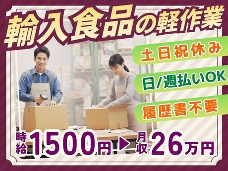 【日勤・土日祝休み】高時給1500円~:月収26万円以上も可/未経験OK!/日払い・週払い可/倉庫内は一年中15度程度で快適◎/〈履歴書不要〉