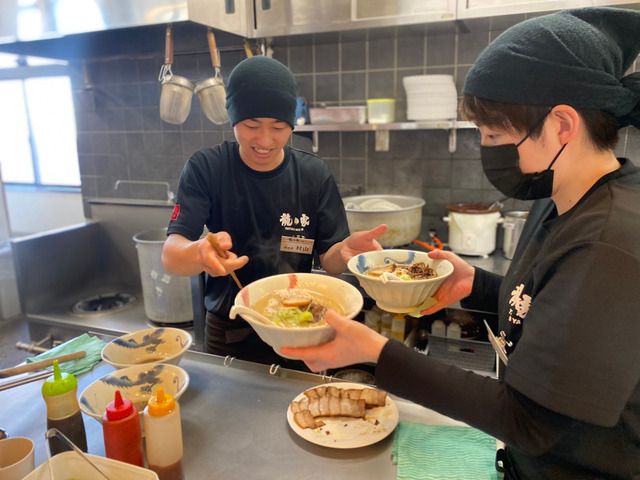 仕事内容 【フリーター・主婦(主夫)さん大歓迎!ラーメン店「龍の家」で一緒に働こう!】 *ラーメンが好きでも、そうじゃなくてもOK! * 久々の職場復帰もパートデビューも大歓迎!先輩がしっかりサポートします♪ * 週1日〜・1日3時間〜!プライベート優先OK!家事・育児との両立◎ * 平日の授業終わり・土日だけなど、シフトの融通バツグン * 嬉しい食事補助あり!スタッフ特別価格でラーメンを食べられます♪ この求人を見てくださっている方には、 ラーメン龍の家のことを 「知ってる!食べたことある!」 「お店は知っているけどまだ食べたことないなぁ」 「いや、店名も初耳で...」 このような方もたくさんいらっしゃると思います。 ですが龍の家を知っている方も、そうではないという方も大歓迎です! 遠慮せずにご応募ください^^ ラーメン龍の家は、 本気でこだわる“とんこつラーメン”をご提供しており、 毎日じっくり炊き上げる濃厚とんこつスープが自慢です! 「本当においしいラーメンを届けたい」という想いで、味にもサービスにも妥協はしません! ー 楽しく働きながら、人としても成長できる ー それがラーメン龍の家です! 《ホール業務》 ・お客様の案内、お冷やご提供 ・ラーメンの配膳 ・テーブル清掃 ・割りばしや辛もやし、紅ショウガ、高菜などのトッピングの補充 ・お会計 ・ビールや飲料の用意 ・仕込みの手伝いやお皿洗いなどキッチン業務のサポート 《キッチン業務》 ・料理の盛り付け ・ラーメンや焼き飯等の調理 ・食器洗い ・鍋振り ・麺入れやスープの仕込 など慣れてきたら本格的な調理業務をお願いします! ◆入社後は! まずは、元気に「いらっしゃいませ!」と言えれば大丈夫です! その後、一緒に働くスタッフとコミュニケーションを取りながら、お店の雰囲気に慣れていただいたら、今度は先輩と一緒に接客の仕方やラーメンの配膳の仕方などを学びましょう。 難しい業務はありませんので、ホールや接客、調理業務が未経験の方でも1週間ほどで基本的な業務には慣れることができるかと思います。 また、先輩スタッフもすぐフォローができるよう体制を整えていますので、ご安心ください! 【福利厚生・待遇】 ・昇給あり ・社会保険完備(雇用・労災・健康・厚生) ・社内レクリエーション(キャンプ、ボウリング大会・スポーツ大会など) ・食事補助(おいしいまかない付き♪) ・社内割引(他事業部サービスあり) ・通勤手当(1日最大700円・社内規定による)※徒歩や自転車も支給対象です! ・深夜手当 ・残業手当 ・正社員登用制度(多数実績あり!) ・制服一部貸与 ・髪色自由! 【あなたに合った働き方がきっと見つかります!】 ・働きながらも子どもとの時間をもっと持ちたい ・扶養内で働きたい ・パートをしながら家事・育児も疎かにしたくない ・子供のお迎えまでの短時間で働きたい ・保護者参加の学校行事の日は休みたい ・子供の急な発熱の際はシフトの相談に乗ってほしい ・夏休み(お盆休み)や春休みは長期休暇が欲しい