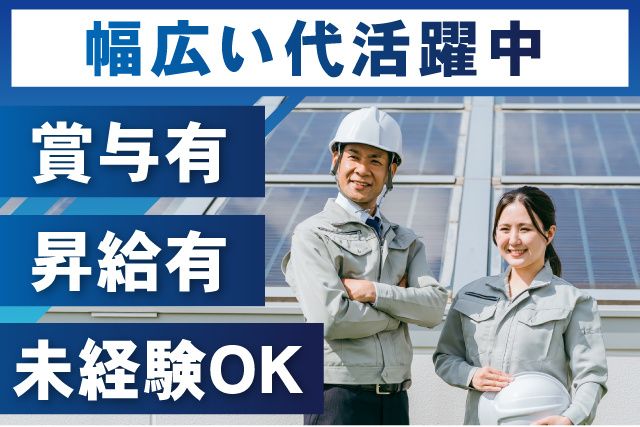 仕事内容 業績好調につき千葉市中央区にて 正社員 太陽光発電システム等 設備工事スタッフを増員募集! 年収例730万円(38歳/経験者1年目) 無資格・未経験からのスタート大歓迎! 一から手に職を付けてしっかり稼げます。 景気に左右されず、仕事量は安定しています。 安定の正社員雇用で、腰を据えて働きませんか? 18歳~20代・30代の若手を中心に、 40代・50代・~65歳の中高年ミドル世代も活躍中です。 女性スタッフも多数活躍中。 日曜休みの他、手当などの福利厚生が充実しています。 【お電話での応募も可能】 090-5417-1777 までお気軽にお問合せください! <オススメポイント> ・正社員雇用で長期安定 ・無資格、未経験スタートOK ・資格取得支援制度有 ・昇給有・賞与有 ・日勤のみ ・中高年ミドルスタッフ活躍中 ・車(マイカー)通勤OK ・直行直帰OK(出張工事もOK) ・女性スタッフも多数活躍中 <お仕事内容> 経験は問いません! 未経験の方には、材料の種類を覚えながら 使用方法を学び、ベテランの仕事のサポートをして 徐々に業務を覚えて頂きます。 住宅・倉庫・農地等での太陽光パネルの設置 太陽光シェアリングや都内では 太陽光パネルの設置義務化等により業務は好調 取引先は県や大手が多く安定して 仕事量がある為長期勤務可能です。 基本直行直帰、昼休憩60分、 10時・15時に20分の休憩があり働きやすい環境です。 1日1現場なので移動はありません。 5名~16名のグループで仕事をします。 現在18歳~65歳のスタッフが活躍中です。 女性スタッフも多数活躍中。 当社は協力会社のスタッフを含め60人体制で 業務を進めています。 <正社員雇用で長期安定> 当社では建設業界の人手不足の原因を追及して、 働きやすさを重視した充実の待遇が自慢です。 離職も少なく、働く職員を とても大切にする会社です。 皆さんが働きやすい環境、長く勤めたい、 と思える環境づくりに力を入れています! <異業種からの転職も歓迎> 今在籍しているスタッフの中には、 前職は全く電気工事とは関係のない 製造業、ドライバー、建築業界、 土木現場作業などをしていた方が多数! ジャンルを問わず募集しています。 少しでも気になった方はまずはお気軽にご連絡ください。 私達と一緒に働いてみませんか。 現在、就業中の方も入社日の御相談など承りますので まずはお気軽にお問合せください。 TEL.090-5417-1777