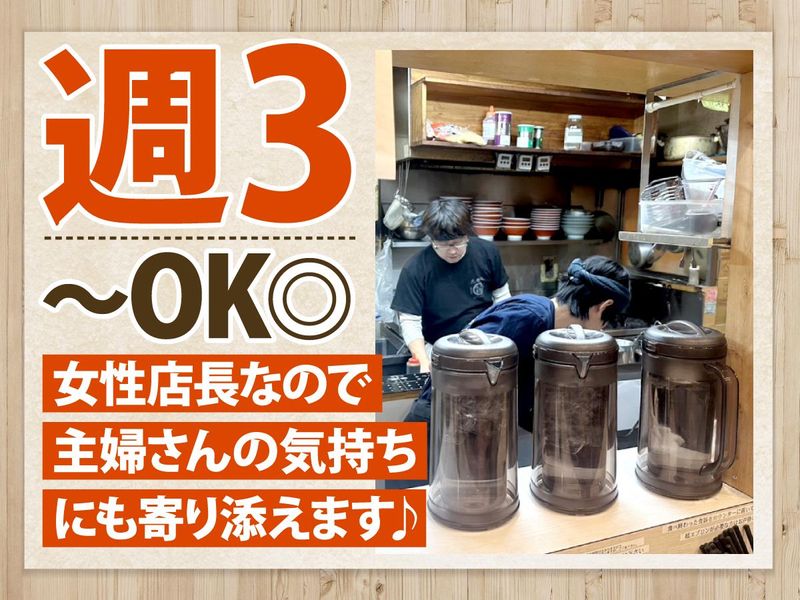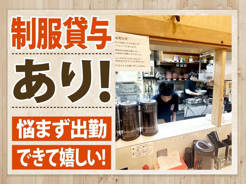 仕事内容 ⭐学生・主婦など幅広い層が活躍! ⭐週3日~/1日3時間~OK◎ ⭐制服貸与ありで服装に悩まない! ⭐簡単作業がほとんどで始めやすい! ✅ 基本的な仕事内容 - ホールスタッフ □お客さまのご案内 □食券の回収/オーダー確認 □ラーメンの配膳 □テーブルの片付け キッチン補助スタッフ □簡単な調理補助 (ねぎを乗せるなど!) □洗い場 などをお願いします◎ ✅ 未経験okな職場! - 初バイトでも、ブランクがあっても大歓迎! 簡単なところから少しずつ教えます◎ まずは、笑顔で 「いらしゃいませ~!」 と言えたらOKです! お昼は主婦さん・夜は学生さんが多数活躍☆ 全員気さくで接しやすいので、 あなたもスグに馴染めると思います! 卒業したスタッフもお客さんとして 帰って来てくれるほど和やかな雰囲気◎ ✅ 製麺所もあります - 最新の設備を搭載している製麺所も◎ 製麺に興味がある方も是非お声がけください!