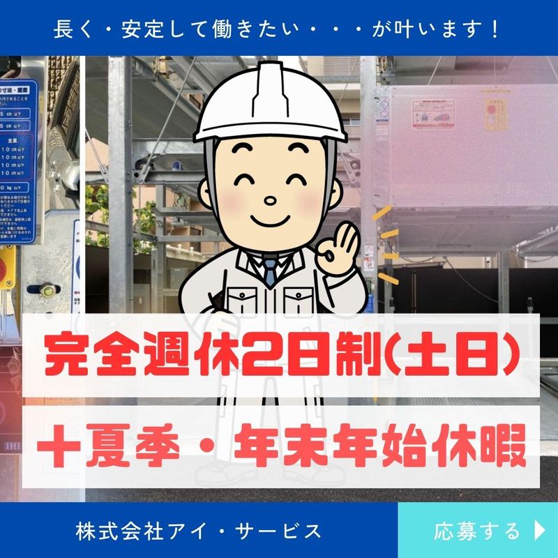 仕事内容 << おすすめPOINT >> ⏩未経験者大歓迎!丁寧にサポート! ⏩賞与年2回など厚待遇をご用意♪ ⏩完全週休2日制でしっかり休める◎ - 大型マンションやショッピングセンターで みかけたことがある立体駐車場が お仕事の舞台です。 ✅機械式の駐車場の 保守及び簡単な点検をお任せします。 ✨専門知識や経験などは一切不問! 駐車場の知識など、 一から丁寧にお教えしていきますので、 安心してご応募ください◎