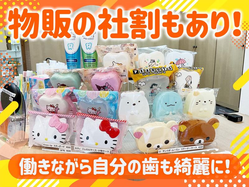待遇・福利厚生 【福利厚生】 「せっかくなら自分の歯もきれいにしたい」 そんな方にうれしいスタッフ特典あり♪ ・ホワイトニング割引あり ・矯正治療割引あり ・歯ブラシ・歯磨き粉など物販割引あり *・。*・。*・。*・。*・。*・。*・。 ・昇給年1回 ・賞与年2回(アルバイトスタッフにも支給あり) ・自転車通勤OK ・冷蔵庫あり ・飲み会などはありません ・Wi-Fi利用OK ・制服トップス貸与(ボトムスは黒・白などのズボン)