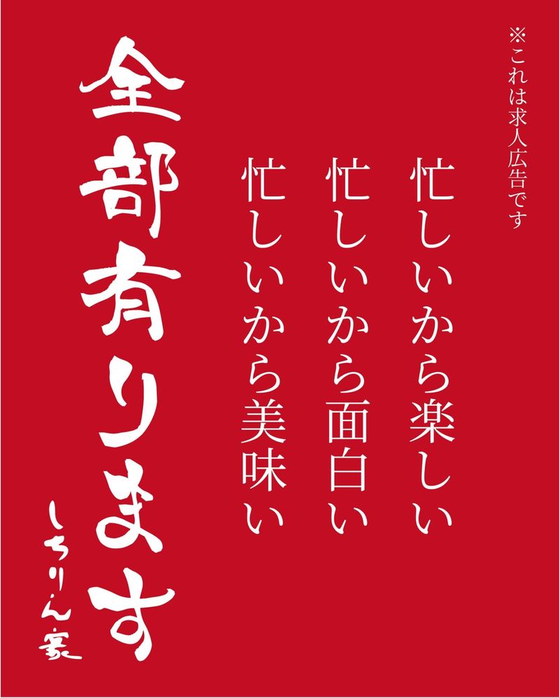求めている人材 未経験歓迎、学歴・経歴不問(経験よりも、人が好き!焼肉が好き!の気持ちを大事にします) 飲食店経営を目指す独立希望の方も大歓迎!支援いたします! しちりん家が掲げる【もっと楽しく、もっと美味しく】 地域の中で絶対必要なお店でありたい。 そんな会長の想いを現在2代目である女社長が引き継ぎこれから さらに 【もっと楽しく、もっと美味しい】しちりん家へ。 地域に応援され、地域を応援するお店になる!価格も、美味しさも。活気の良さも。 全てひっくるめて地域の応援団でありたい! そう、しちりん家は思っています。 まだまだお店としても、会社としても足りない部分がありますが、ひとつひとつ中身も一新し、 地域の新たな時代を引っ張れるお店になれるよう頑張ります! 仕事って楽しい!面白い! 焼肉って美味しい!楽しい!をもっともっと突き詰める! そんな熱い仲間をしちりん家は募集してます! 新たなしちりん家を作り上げる一員として一緒に汗を流しませんか?