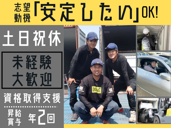 仕事内容 海外に⾞を届ける輸出業務において、 ⾞をあずかり、船に載せるための 準備を⾏う敷地(=ヤード)での お仕事を担当していただきます。 【仕事内容】 ー ◆車両の受付・移動 社内の管理システムを使って、 車両を管理しています。 PCの文字入力ができればOK! ◆写真撮影 輸出に必要な記録用の写真を撮ります。 →後から「どの状態で預かったか」が 分かるようにするためです! ◆車両チェック 外装・内装の状態や、ライトがつくか、 メーターが動くかなどの確認作業。 車に詳しくなくても先輩が教えてくれるので安心です。 ◆コンテナへの積み込み 海外へ送るための車を、 運転またはフォークリフトで コンテナに載せます。 フォークリフトの資格は 入社後に会社負担で取得できます。 ◆車の固定 輸送中に車が動かないように、 ワイヤーでしっかり固定します。 品質を守るための大切な作業ですが、 必ずチームで行うので安心です。 \仕事紹介動画/ https://www.youtube.com/watch?v=8pYZsNeqyWk URLをコピーしてご視聴ください! 異業種からの転職者が多数活躍中! 研修体制も整っており、わからないことは すぐに聞ける環境なので安心してください。 完全週休2日制で土日祝休みのため、 ご家庭などと両立がしやすいです。 ✅先輩に聞きました!✅ ________ <ここは覚悟してて!> よく歩きます笑 屋外でおこなう作業も発生するので 夏は暑く冬は寒いです…! 最初は筋肉痛にもなりました笑 <ここがオススメ!> ・ワークライフバランスが整います! 残業が少なく、土日祝日がお休みなので 家族・子供との時間をしっかりとれるようになりました。 ・明るく穏やかな社員が多いです。 ・海外へ届き、現地の生活に役立っていると考えると、 大きなやりがいを感じます。 *~*~*~*~*~*~*~*~*~* 【シンクロジスティクスについて】 ー 当社は、⽇本の中古⾞を 世界に「届ける」サポートを ⾏っている会社です︕ 実は、⾞⼀台を輸送するのにも 10以上の業務があり複雑なんです… そんな輸送業務を⼀⼿にサポート︕ 独⾃開発のシステムで⼀括管理、 ⾃社でヤードを運営することで、 スムーズな運⽤を実現。 お客様の輸出台数の最⼤化を⽀援しています。 設⽴から11年で売上規模は 37億円まで成⻑しました。 現在では⼤⼿物流会社数社と 業務提携を⾏い業績も安定、 現在は90ヵ国以上への輸出を⾏っています。