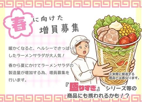 仕事内容 仕事内容について ローソン商品の盛り付け作業をお願いします。 春から夏にかけてラーメンサラダの製造量がどんどん増え、夏ごろには完全にラーメンサラダメインで盛付を行っていただきます。 入社すぐの頃はお弁当のからあげを5個盛付、かつ丼1枚セットを盛付など個数で分かりやすい業務もお任せします♪ 春に向けた8名の増員★ ラーメンサラダの製造スタッフ募集 ローソン北海道全店舗に並ぶサラダ・おにぎり・お弁当・スイーツ・お惣菜を製造・発送している食品工場で、春に向けた8名の増員募集を行います! 春限定の新商品なども続々発売予定!SNSなどでも話題沸騰の“盛りすぎ”シリーズなど、今まさに注目を集める商品の製造にも携わることができます。 子どもの帰りを待ちながら、ちょこっと働いてみようかな? 11:30~15:30のスキマ4時間で働く! しかも扶養内で月8万円がちょうどいい♪ ◇学校 行事などのお休みほぼOK ◇家庭優先で働ける ◇ ブランクありでも安心のシンプル作業 「家事ばっかりじゃなくて、気分転換したいかも…」 「自分のお小遣いで好きなモノ買おっかな?」 そんな気持ち、ここで叶えませんか? 無理せず少しだけ、ちょうどいい働き方です。 ★30か所の乗り場がある送迎車運行中!通勤ラクラク♪★ < あなたが乗車しやすい場所があるはず・・・!> 清田区/厚別区/白石区方面 広範囲に運行中! 里塚/北野/平岡/もみじ台/新札幌/本通り/南郷/白石…付近 ◇幹線道路やバス路線の運行が基本になります ◇ルート内であれば送迎場所は相談できます ◇もちろん車通勤もOKです。 ■来社不要|オンライン説明会 実施中■ 「工場ってどんな雰囲気?」 「私にもできるかな…?」 「久しぶりの仕事でちょっと不安」 そんな疑問や不安を解消しませんか? オンライン説明会は“話を聞くだけ”でOK! 応募したい!と思ったらオンラインのまま面談にも進めますよ♪ 実施曜日:毎週 月曜日・水曜日・金曜日 11:00/15:00開催 ・スマホやPCがあればOK ・ご自宅から参加ができる ・服装髪型お化粧自由! お仕事の内容や勤務条件を丁寧に説明し、勤務時間など条件面の相談や細かな質問にもきちんとお答えします。 「少しだけ気になる」その気持ちでご参加OKです。 説明会参加のご案内についてはご応募後、お電話にてご連絡させていただきます。 仕事内容について 北海道限定で発売されているソウルフードラーメンサラダを完成させるお仕事です。 自分担当具材を手に持って、丁寧に盛り付けしていくお仕事。 「料理とか得意じゃないんだけど・・・」 そんな方も決まった手順に沿って進めていけば大丈夫! 周りのスタッフがしっかりサポートします。