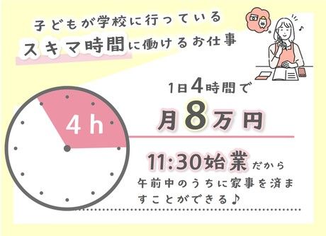 勤務時間 ・勤務時間: [1] 11:30~15:30 ?月~金の休日希望 → 100%融通が利きます ?土日休み →75%対応OKです! 参観日・運動会・発表会…お子さまの行事はほぼ皆勤賞で参加OK! ご家庭も大切にしながら働ける環境です。 勤務日数:週4日(月17~18日程度) 11:30~15:30(休憩なし)