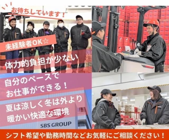 仕事情報 ● 仕事内容 大手ドラックストアやコンビニ向けの冷蔵食品や常温品を、納品先ごとに仕分けするお仕事です。間違いを減らすために業務を簡素化していますので、初めての方も覚えやすいお仕事です。商品は軽くて持ちやすく(3~12KGほど)、台車を使用いたしますので、体力的な負担が少なく、健康的に働けます。 丁寧にサポートいたします 食品を種類ごとに検品し、店舗ごとに仕分けするお仕事です。モクモク・コツコツとお仕事したい方におすすめです。先輩スタッフが丁寧にサポートいたしますので、安心してお仕事を始められます。シフト調整もお気軽にご相談ください。倉庫内は10℃となっており、夏は涼しく冬は外より暖かい環境となっております◎ 職場の雰囲気◎前払いOK! 職場内では役職者も含めて全員が「さん」付けで呼びあい、みんなが遠慮なく意見を言い合える環境づくりを心がけています。ご希望のお休みも取りやすい環境です。お気軽にご相談ください。また、給与の前払いOK!スマホで簡単、支給日前に給与を受け取れます!振込手数料は全額会社負担で、上長承認や理由記載不要です。 スタッフの健康をサポート グループの健康保険組合では、常備薬の割引や、24時間健康相談、インフルエンザワクチンの接種の補助など健康を保つためのサービスが目白押し。セカンドオピニオン・医師紹介サービスもしていますので、健康に不安があった際には活用ください。健康的に長く安定して働くことができる職場です。 東証プライム上場安定性◎ SBSフレックネットがお届けするのは、お客さまの生活に欠かせない食品。会社の強みである輸配送全国ネットと、低温管理ノウハウは、お客さまの安心安全な「食の当たり前」を支えます。3温度帯に対応できる会社として、業界トップクラスの品質と実績を持つSBSフレックネットで誇りをもってお仕事しませんか?